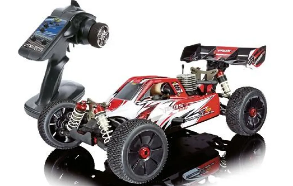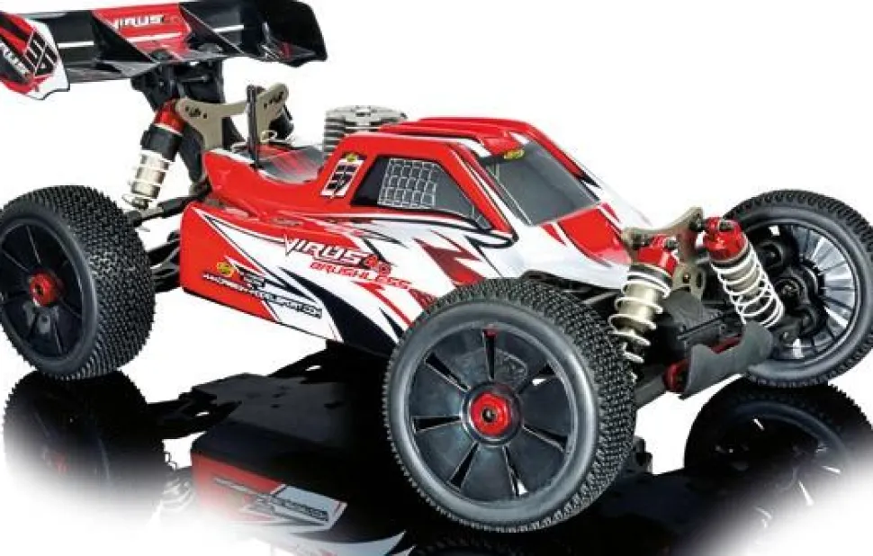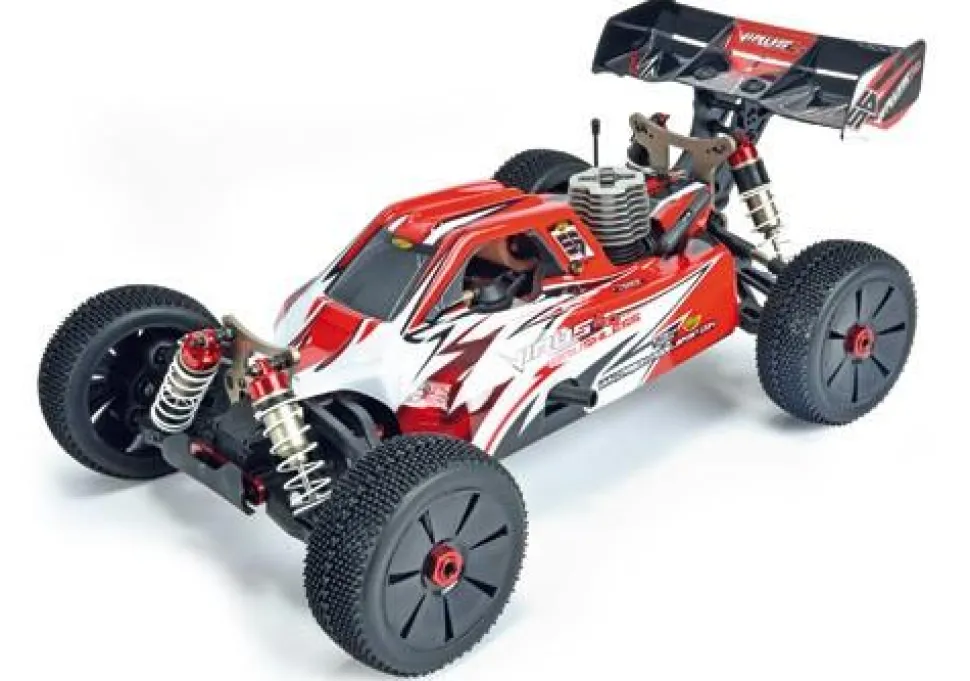 Buggy 1/8 thermique RTR, avec radio 2.4GHz Le buggy CARSON VIRUS 4.0 version thermique possède une conception de châssis moderne. La boite radio est de type « étanche » afin de résister aux projections d’eau. L’ensemble radio est de type 2.4 Ghz (REFLEX WHEEL PRO) le rendant insensible aux interférences.
