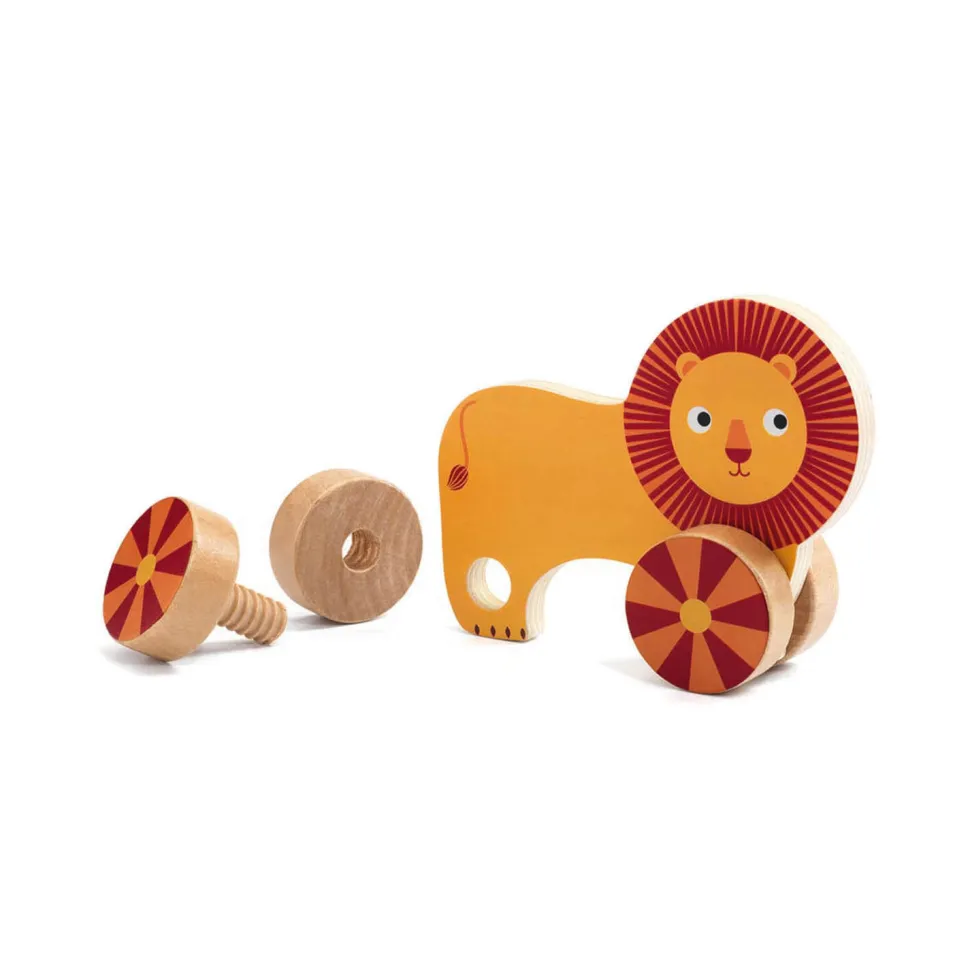 Pour faire avancer ses petits compagnons, le lion, la baleine, l’éléphant, votre enfant devra d’abord les mettre sur leurs roues ! Glisser, visser et c’est parti, en route … les animaux peuvent partir en vadrouille !Accessibles aux petites mains des enfants à partir de 2 ans, les pièces en bois sont rondes et en bois et faciles à manipuler.Votre enfant devra simplement glisser les vis colorées dans les pattes des animaux et les visser, une manière amusante de développer sa motricité fine et sa coordination. Une fois le jouet monté, place à l’imagination et à des courses d’animaux dans la maison ! Contenu : – 3 animaux à visser (15 pièces)Dimensions d’un animal (sans les roues) : 12 x 9 cm.