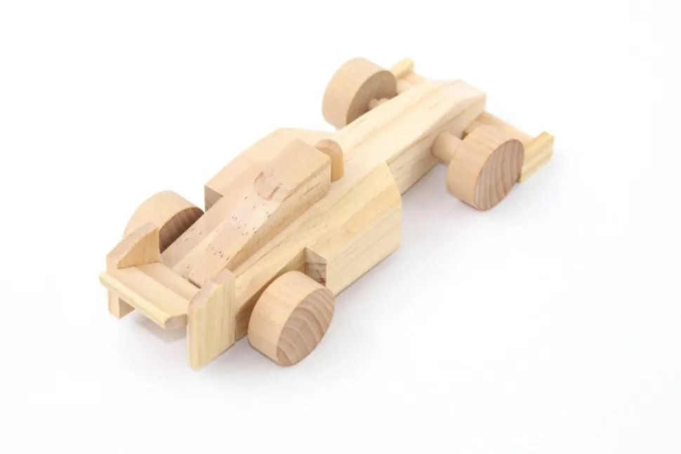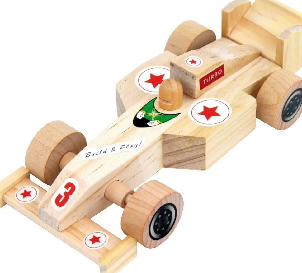 Construisez-la d’abord, puis jouez avec. Voici les instructions : insérez l’axe dans le châssis, collez les roues, l’aileron et le pilote, et vous voilà prêt à courir ! 16 pièces suffisent pour former une voiture de course. Collez-les pour les fixer. Matériau : bois. Dimensions : 18 x 7 x 4 cm. Âge : 3 ans.