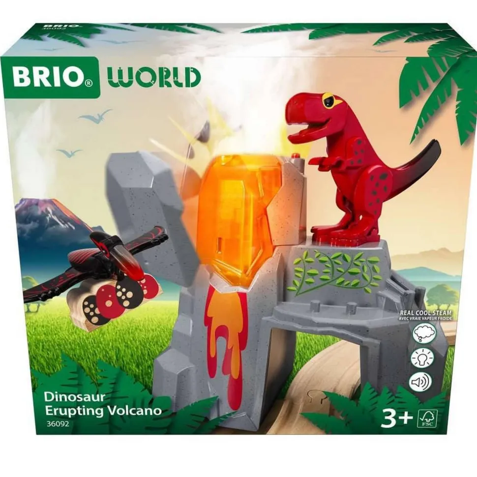 Un grondement, puis boom ! Le volcan est sur le point d’entrer en éruption ! Créez des aventures préhistoriques épiques en intégrant ce coffret et ces figurines sur le thème des dinosaures dans vos circuits BRIO World. Réveillez le volcan : appuyez sur le bouton au sommet pour activer la lave, les sons du volcan et la vapeur d’eau froide (sans risque pour l’enfant) provenant du volcan. Puis, regardez-le exploser. Le T-Rex se tenir fièrement au sommet, surplombant son royaume !