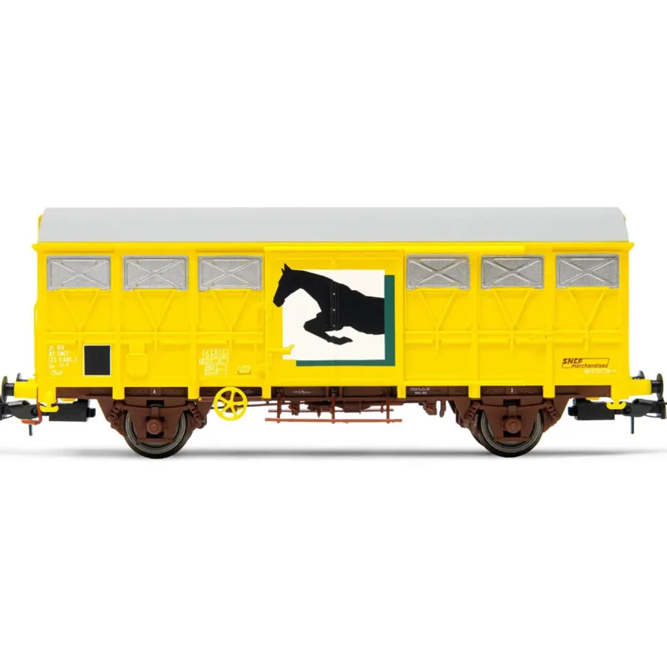 Caractéristiques détaillées : Wagon fermé SNCF à 2 essieux Gs pour le transport de chevaux, jaune