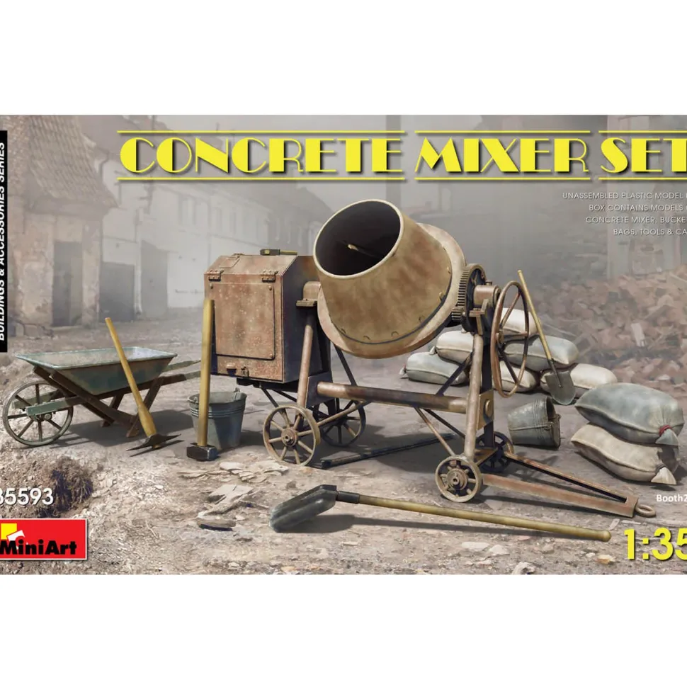 Accessoires de dioramas en plastique.Contient :- Bétonnière- Chariot de construction- Sacs en toile de jute- Seaux- Outils de construction (pioche, marteau, ferraille et pelles)Échelle : 1/35.Peintures non fournies.