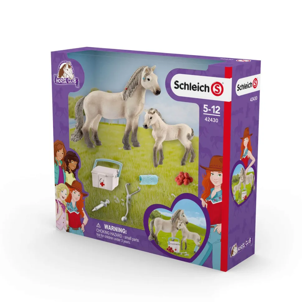 Prenez soin des chevaux du Horse club grâce à ce kit de secours ! Ouvrez et découvrez ce que contient la mallette de secours et apprenez les gestes pour soigner toutes les blessures de vos figurines chevaux !Quand elle sera grande, Hannah aimerait bien devenir vétérinaire, comme sa mère. Alors qu’une jument islandaise donne naissance à son poulain, Hannah est très excitée et prête à intervenir avec son kit de secours. Heureusement, la jument et son poulain sont en pleine forme. Quelle journée magnifique ! Hannah ouvre quand même la mallette du kit de secours pour en sortir le stéthoscope, afin d’ausculter les deux chevaux et de s’assurer que tout est en ordre.Contenu de la boîte :- 1 figurine ponette islandaise, – 1 figurine poulain islandais, – 1 mallette de secours, – 1 seringue, – 1 bandage ,- 1 stéthoscope, – 1 pommeDimensions de la boîte : 19 x 5,2 x 17.3 cm.