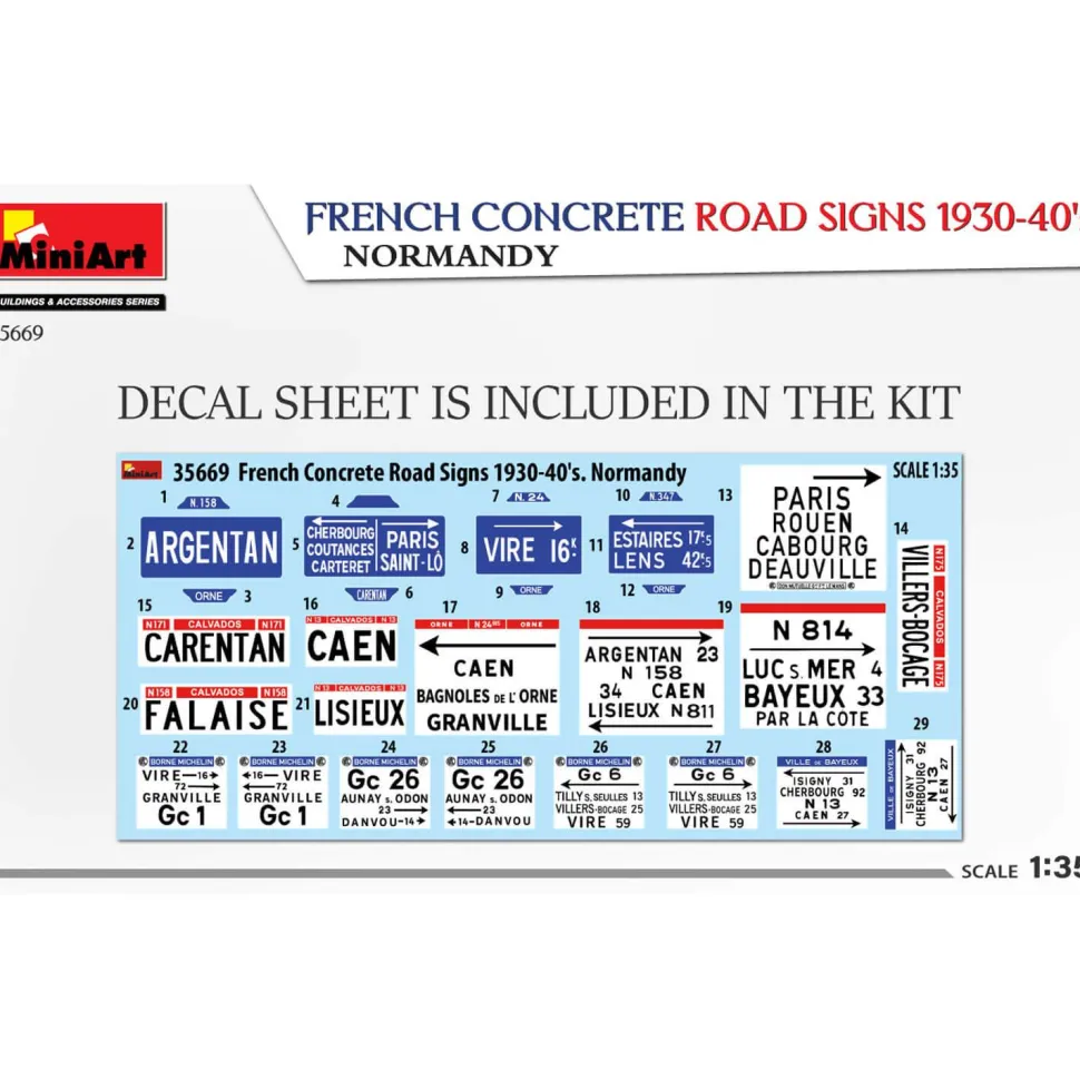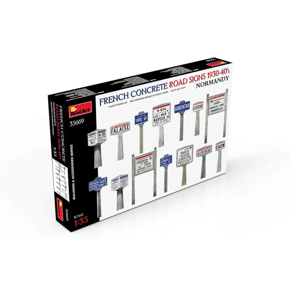Accessoires pour diorama à assembler, de la marque MiniArt : Panneaux routiers français en béton des années 1930-40, Normandie. Échelle : 1/35.