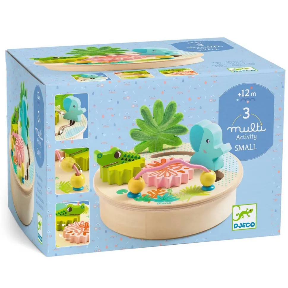 Une petite table d’activités en bois naturel et aux couleurs vives, destinée aux enfants à partir de 12 mois. L’enfant joue avec les différents éléments qui composent cette table d’activités : déplacer les perles du boulier, tourner les engrenages et faire glisser l’éléphant sur le chemin pour le cacher derrière le buisson.