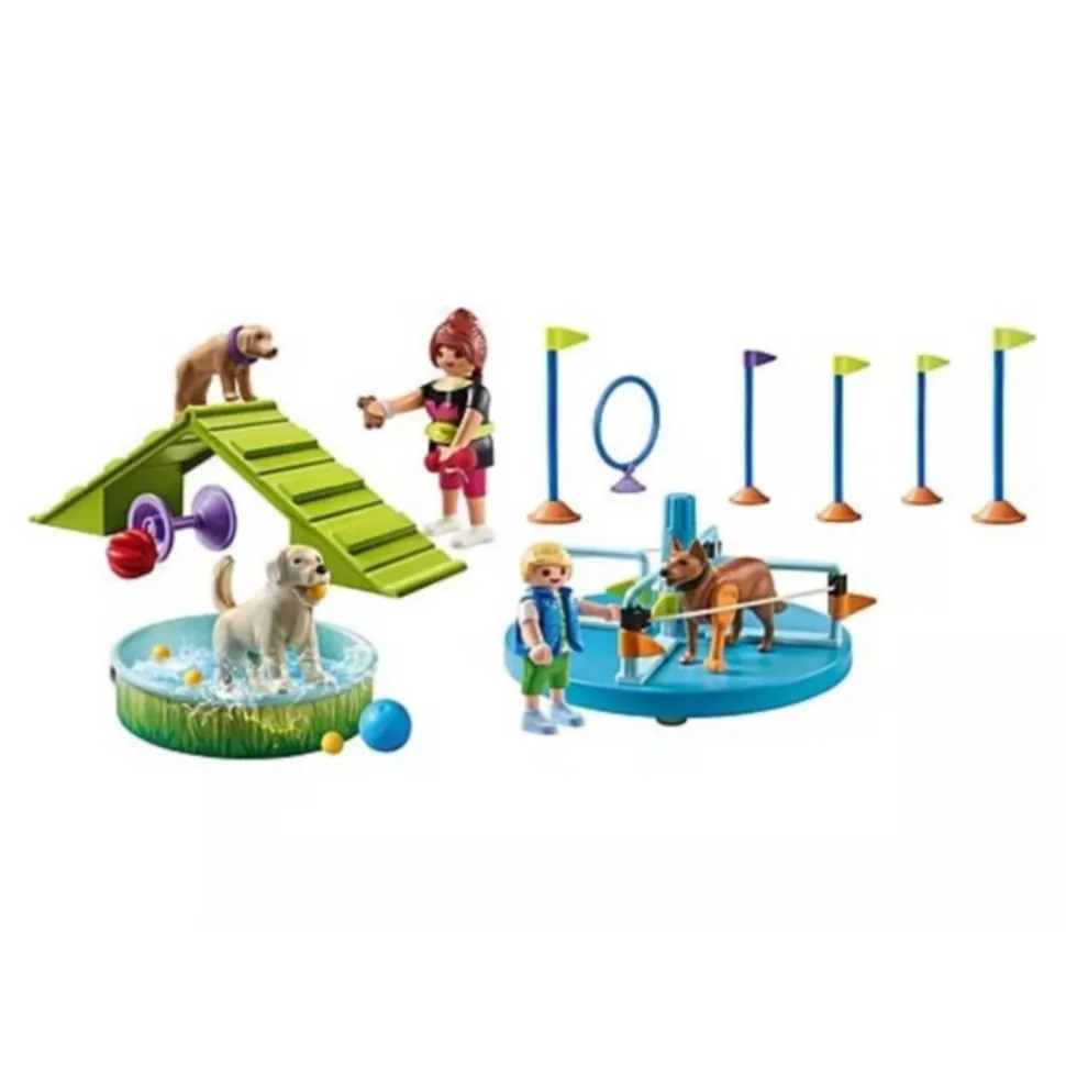 Contenu du jeu : 61 pièces dont 1 femme, 1 garçon, un chien de berger avec prothèse, un chien de chasse et un Terre-Neuve, 3 piquets de slalom avec fanions, 1 carrousel avec fanions, 2 rubans de barrage en caoutchouc, 1 anneau avec plaque d’appui, 1 pataugeoire, 4 petites balles, 1 grosse balle avec poignée, 1 rampe de course, 4 jouets pour chiens, 4 friandises, 1 ceinture, 1 laisse pour chien, 2 colliers pour chiens, 2 bracelets en silicone