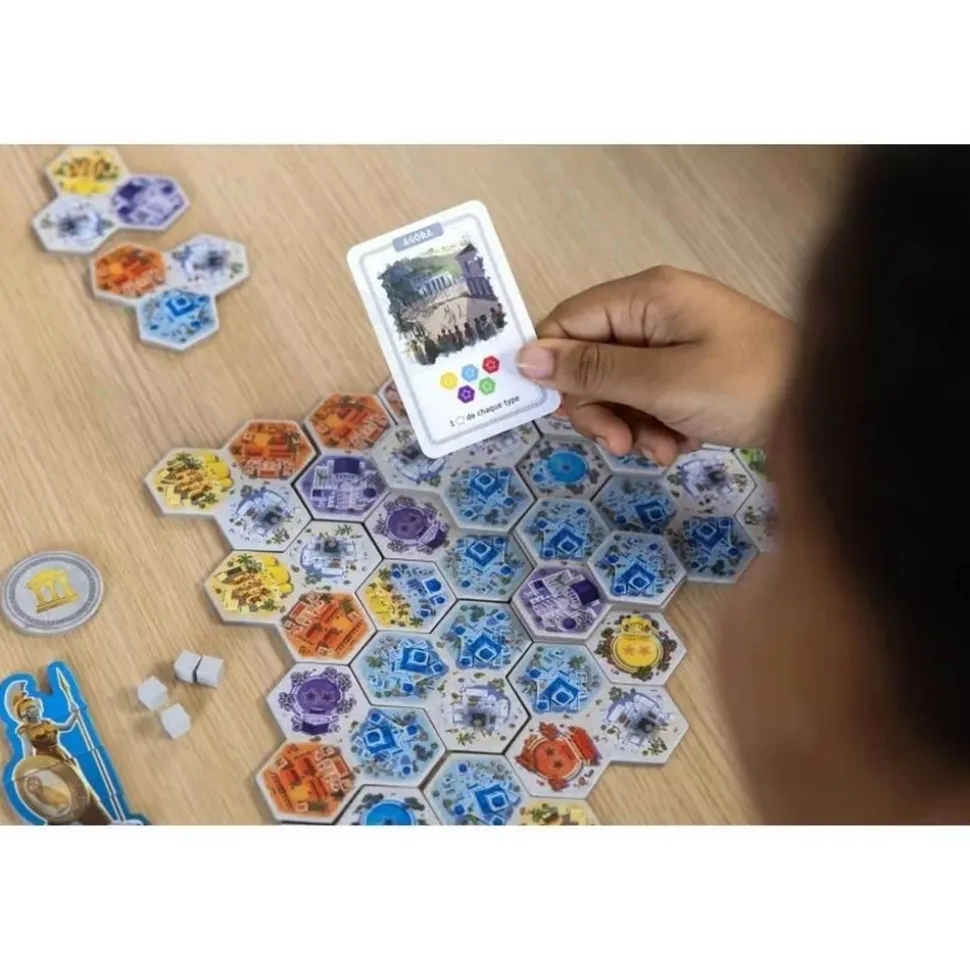 Contenu : 18 cartes Construction, 30 mini-tuiles (10 Places, 10 Quatiers, 10 Doubles-Quartiers), 4 statues d’Athéna composées de 4 parties chacunes, la règle du jeu