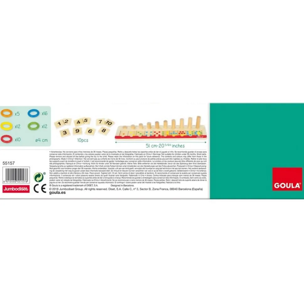 Un jeu en bois pour apprendre à compter en visualisant les chiffres et les quantités. L’enfant doit associer les chiffres avec le nombre de points correspondant avec la quantité d’anneaux. Un code couleur lui permet de mémoriser les chiffres plus facilement. Il s’agit d’une façon ludique d’apprendre à compter, avec l »utilisation des couleurs comme moyen mnémotechnique. Un jeu en bois de qualité pour des manipulations fréquentes.