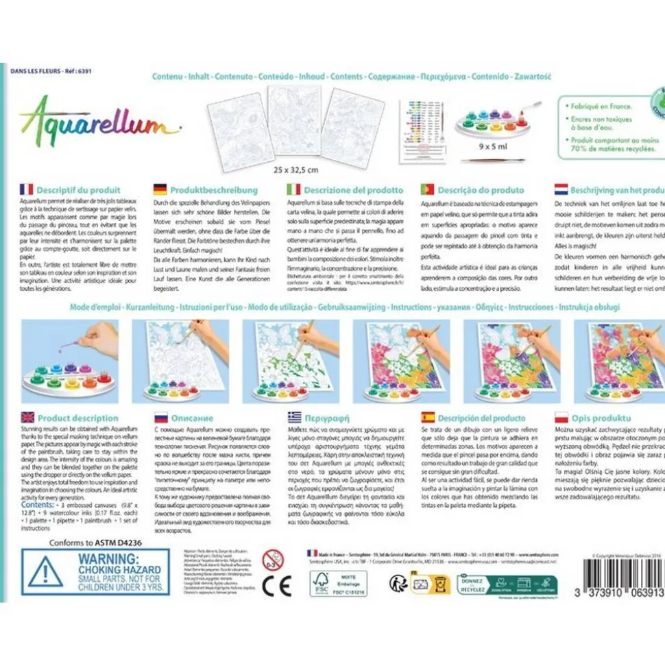 A vos pinceaux !Appréciez l’arrivée du printemps ! Avec ce coffret Aquarellum Dans les fleurs, peinez ces magnifiques fleurs de couleurs chatoyantes pour que les insectes apprécient de venir les butiner. Célébrez l’arrivée des beaux jours !La technique de sertissage permet de réaliser de très jolis tableaux : le pinceau ne déborde pas, les motifs ressortent dès que l’on passe les encres et les couleurs surprennent par leur intensité.Les couleurs ont été sélectionnées pour s’harmoniser entre elles et permettent à l’artiste de peindre tout en laissant libre cours à son imagination : le résultat est toujours réussi.Une activité manuelle idéale pour les enfants comme les plus grands !Contenu du coffret : -3 tableaux sertis 32,5 x 25 cm -9 flacons d’aquarelles lavables et non toxiques-1 pinceau aquarelle de très grande qualité-1 palette pour mélanger les encres-1 pipette-1 notice
