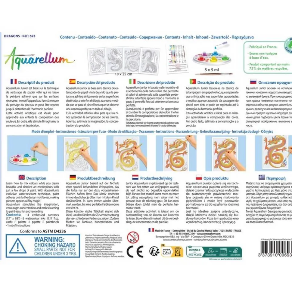 Fantastique ! Quelques gouttes de peinture et tous les enfants pourront réaliser de véritables chef-d’oeuvres. Aquarellum Junior est basé sur la technique de sertissage sur papier vélin, qui ne laisse la peinture adhérer que sur des surfaces réservées. Le motif apparaît au fur et à mesure du passage du pinceau et peut être repeint jusqu’à ce que le tableau soit parfait. Une activité idéale pour initier les enfants à l’art en comprenant le mélange des couleurs, stimuler l’imaginaire et la concentration. Contenu de la boîte : – 4 tableaux sertis 18 x 25 cm – 1 pinceau aquarelle de très grande qualité – 1 palette pour réaliser ses gammes de couleurs, – 5 flacons d’encres lavables non toxiques – 1 pipette pour doser les aquarelles, – 1 notice sur la perception des couleurs1 à 2 heures d’activités. Dimensions de la boîte : 26.5 x 19.5 x 3 cm.Les 4 tableaux sont sur le thème des dragons. L’enfant sera enchanté, une fois ses chefs d’oeuvre terminés, de pouvoir les accrocher dans sa chambre.