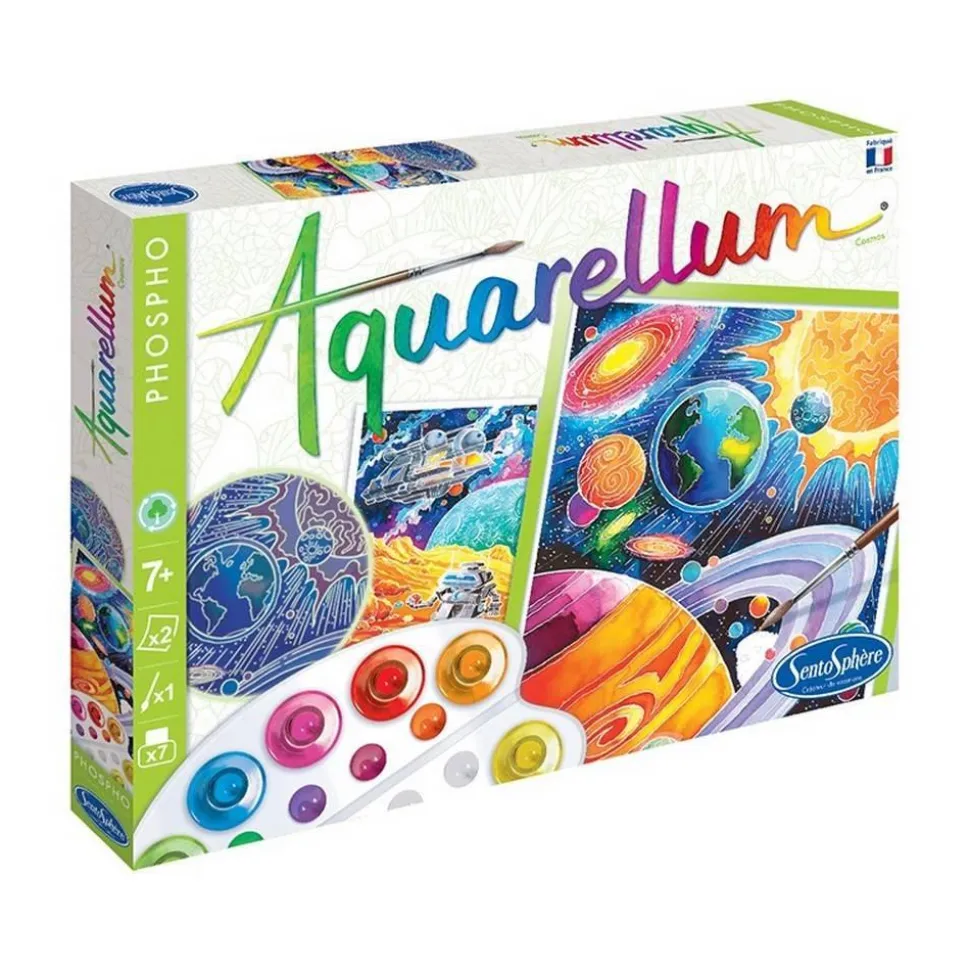 Voyagez de jour comme de nuit dans l’espace à travers cette activité artistique Aquarellum Phospho Cosmos !Vous pourrez ainsi vous évader dans un univers spatial et découvrir les galaxies tout en créant des belles peintures qui s’illumineront dans l’obscurité !Contenu du coffret :- 2 tableaux sertis 25 x 32,5 cm- 7 flacons d’aquarelles lavables et non toxiques- 1 pinceau aquarelle de très grande qualité- 1 palette pour mélanger les peintures – 1 pipette- 1 notice avec un nuancier de couleursCe coffret propose deux tableaux sur le thème de l’espace que vous pourrez faire briller une fois la lumière éteinte grâce au serti phosphorescent, développé tout spécialement pour les 20 ans d’Aquarellum.Aquarellum Phospho est en effet un loisir créatif basé sur la technique d’un serti phosphorescent sur papier vélin, ce qui permet de réaliser un dessin d’un grand raffinement : le pinceau ne déborde pas, les motifs apparaissent comme par enchantement dès que l’on passe les encres, les couleurs vous surprendront par leur éclat, et les contours s’illumineront dans le noir !