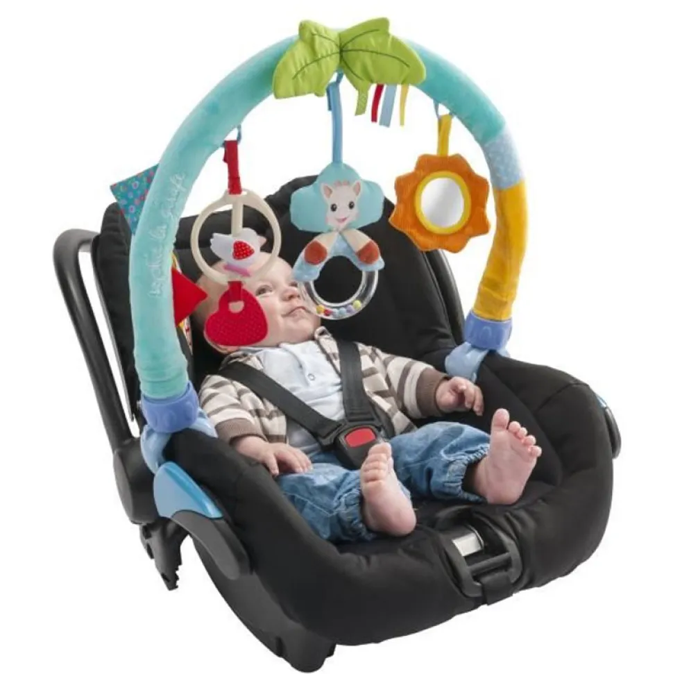 L’Arche d’éveil Sophie la Girafe s’adapte à Bébé : elle peut s’incliner pour que les jouets suspendus soient plus proche de lui afin qu’il les saisisse plus facilement. Cette arche d’activités nomade, se fixe sur de nombreux supports grâce à ses pinces universelles ( poussette, transat, voiture, lit…). Elle est facile à positionner et à retirer.Plusieurs jouets sont accrochés à cet arche :- Un hochet à l’effigie de Sophie La Girafe avec des billes colorées- Un anneau de dentition- Kiwi, l’oiseau à faire tournoyer- Un miroir pour vois son reflet- Des étiquettes au bruit de papier froissé à manipulerCette arche devient très vite indispensable à bébé dans tous ces déplacements. Les objets sont amovibles pour qu’il puisse jouer avec dans le parc ou dans le lit !