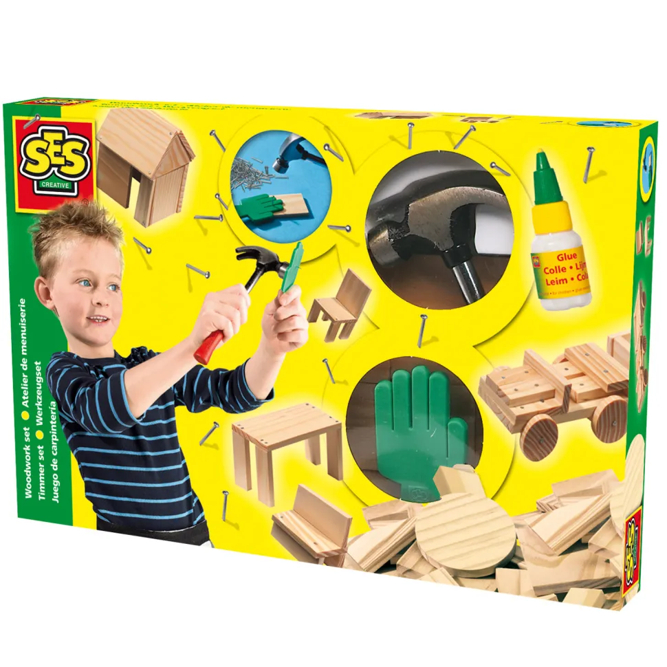 Comme Papa, construisez de nombreux jouets et objets en bois avec les 57 pièces de bois de diverses formes et tailles. Grâce à la main spéciale qui va tenir les clous, aucun risque de se faire mal aux doigts ! Contenu :- 57 pièces de bois- Colle à bois- Marteau- Clous- La main spéciale pour tenir les clousA partir 8 ans.