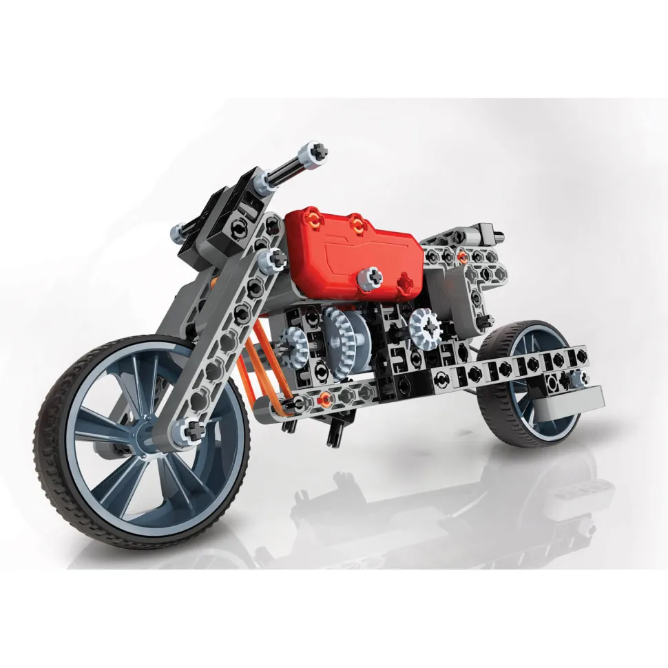 Un coffret scientifique innovant pour découvrir les secrets de 2 véhicules surpuissants : un roadster et un dragster.Contenu : plus de 130 composants sont inclus dont une boîte de vitesses, des engrenages, des jantes, des pneus, des élastiques, des barres, des poulies, etc.A travers ce coffret de construction, l’enfant va découvrir la transmission du mouvement. Pour cela, il va construire lui-même un roadster et un dragster en modèle réduit en intégrant leur système de transmission. En assemblant leurs vrais mécanismes, il comprend mieux le fonctionnement des engrenages.Inspiré de la méthode STEM, ce jeu aide à développer la manipulation pour donner forme aux idées, la stimulation pour émettre des hypothèses et expérimenter, la créativité pour développer de nouveaux projets.Dimensions de la boîte : 28 x 19 x 4,7 cm.