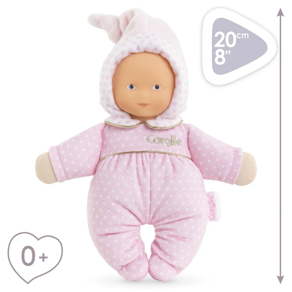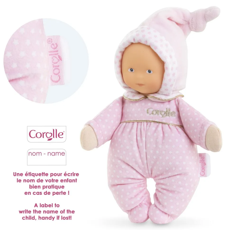Quand mes parents m’ont tendu le doudou Babidoux pour la première fois, ils l’ont légèrement agité. J’ai tout de suite entendu un petit tintement qui m’a fait sourire. Pour réentendre ce petit bruit, j’ai saisi mon doudou Babidoux par son bonnet, je l’ai fait bouger, et le son du grelot était encore là ! Chaque jour, je reproduis ce mouvement et je cherche d’où il peut bien provenir. J’attrape facilement mon doudou babidoux par ses bras : il est tellement léger ! Je le sers tout contre moi : j’aime sa grande douceur ! Dès que j’approche mon nez de son visage réaliste et rassurant, je sens la délicate senteur de vanille m’envelopper. Cette odeur permet de me réconforter, même quand mes parents sont loin de moi. Grâce à sa petite taille (20 cm), mon doudou Babidoux se glisse partout; pas question de le quitter ! Mon Babidoux et moi, on est inséparables. Car même si je l’oublie quelque part, on me le rendra : il possède une étiquette pour écrire mon prénom ou le numéro de téléphone de mes parents. Lavable en machine, cycle délicat. mon doudou Corolle : Toi et moi, pour toujours. Dès la naissance.