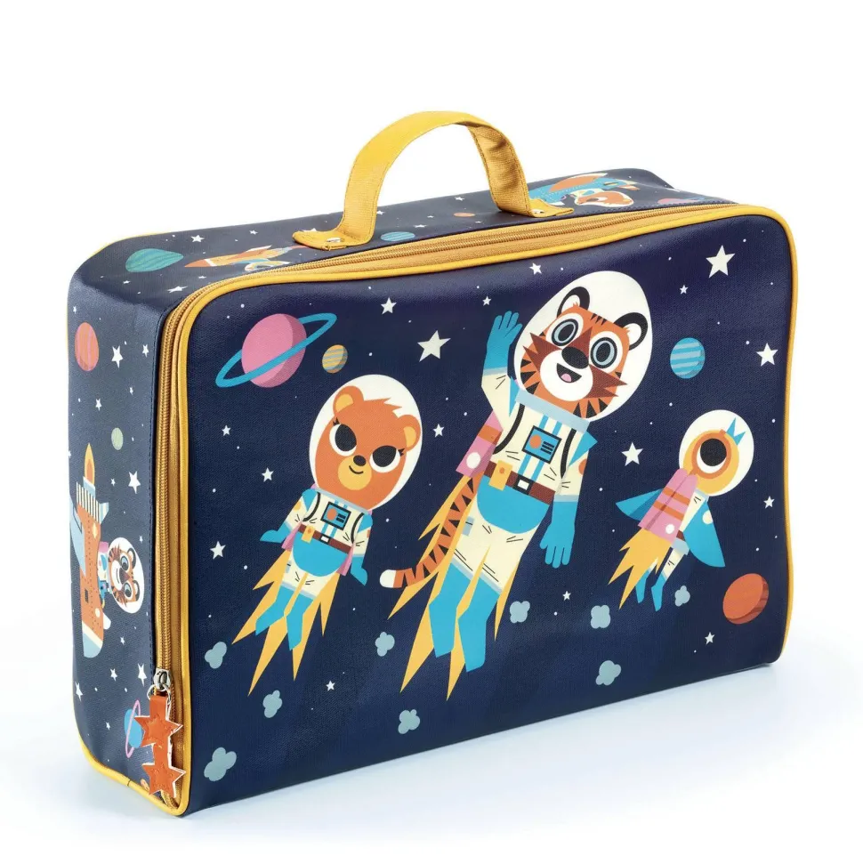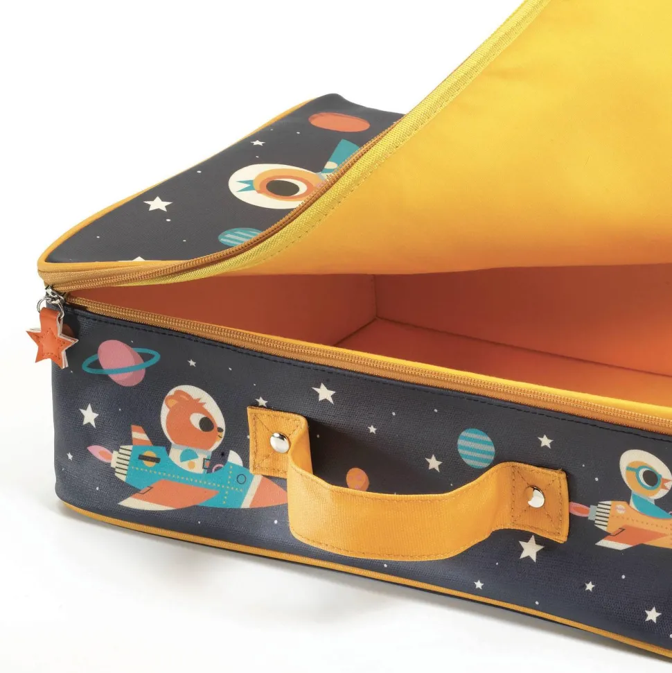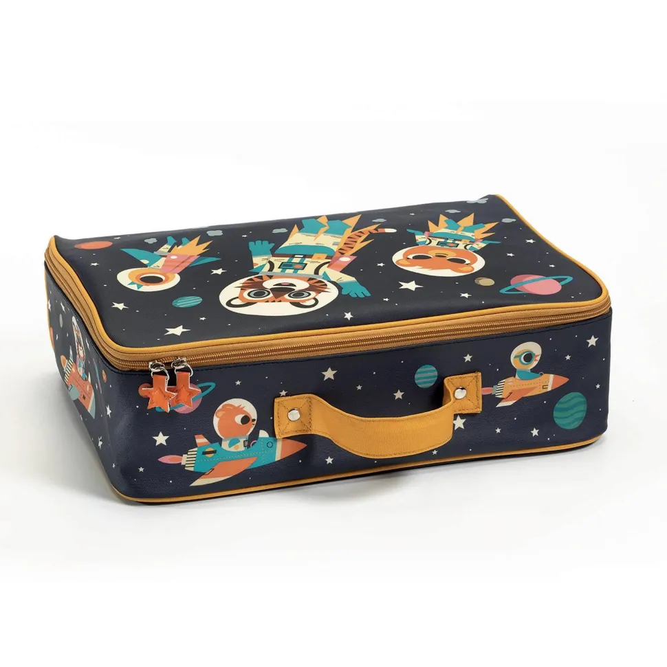 Découvrez la gamme de BAGAGERIE avec la collection LITTLE BIG ROOM et le sac Espace de la marque Djeco. Une valise joliment illustrée d’un décor spatial, parfaite pour emporter les affaires des petits astronautes. Cette valise est imperméable. Son intérieur textile se compose d’un grand compartiment spacieux, idéal pour ranger vêtements, jouets ou accessoires liés à l’univers spatial. Légère et facile à manipuler, elle s’attrape rapidement grâce à sa poignée solide, parfaitement adaptée aux petites mains. Imperméable, elle protège efficacement son contenu contre l’humidité et les éclaboussures. Livrée à plat pour un gain de place lors du rangement. Sa structure rigide assure une excellente protection des effets personnels pendant les déplacements. Elle est dotée d’une fermeture éclair à glissière bidirectionnelle, ornée d’un joli médaillon qui complète harmonieusement le design galactique. L’extérieur est en coton plastifié à 100 %, résistant et facile d’entretien, tandis que l’intérieur est composé à 80 % de coton et 20 % de polyester pour une finition douce et robuste. Lavage en surface uniquement recommandé pour préserver la qualité des matières.