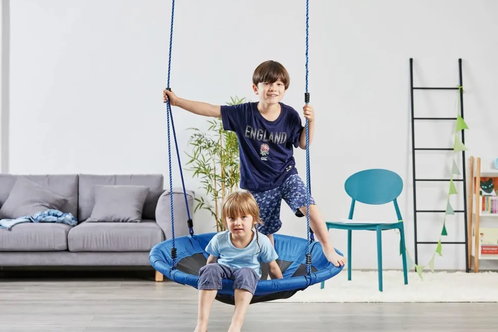 Même à l’intérieur, détendez-vous et balancez-vous confortablement. Dans cette confortable balançoire nid d’oiseau, jusqu’à deux enfants peuvent s’asseoir, se balancer et jouer. Conseil : ce nouveau coin préféré est encore plus confortable avec un coussin ou une couverture. Corde de suspension de 180 cm incluse, réglable avec deux anneaux. Charge maximale : 150 kg selon le type de suspension. Matériau : tubes métalliques recouverts de mousse et recouverts de polyester. Dimensions : Ø 100 x 7 cm. Âge : à partir de 3 ans, sous la surveillance d’un adulte.