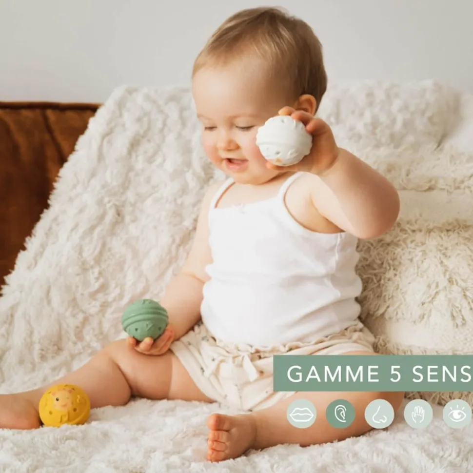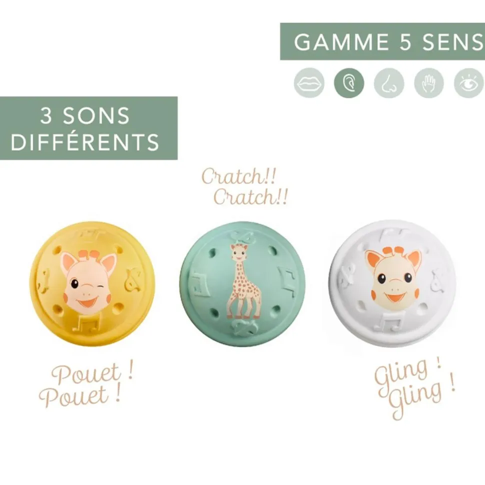 Avec ce set de 3 balles musicales Sophie la girafe aux sons différents stimulez le sens de l’ouïe de votre bébé !