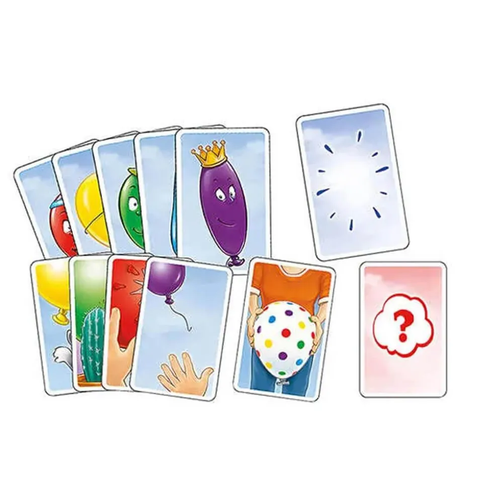 Principe du jeu : Chaque enfant a 5 jolis ballons colorés. A son tour, un joueur tourne une carte action : les griffes du chat, les piquants des roses ou le vent mauvais peuvent faire disparaître un de ses ballons… mais Maman peut le faire réapparaître.