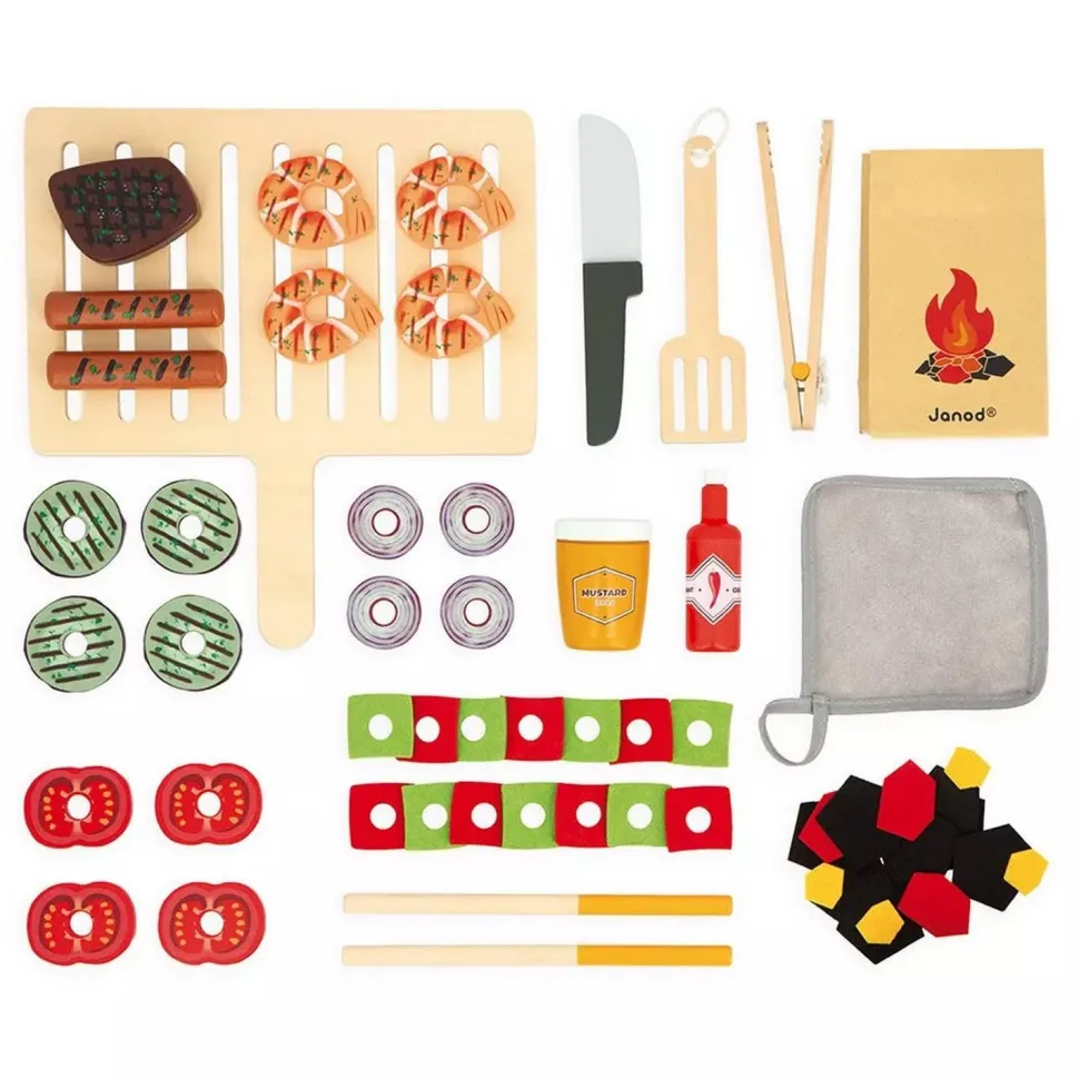 Grâce à ce Barbecue mobile sur pieds, les enfants à partir de 3 ans pourront s’amuser à cuisiner pour leurs copains. Au menu, de nombreux accessoires pour développer l’imagination culinaire : 57 en tout ! 35 ingrédients gourmands (2 saucisses, 1 steak, 4 tranches de tomate, 14 tranches de poivron en feutrine, 4 crevettes, 4 tranches d’aubergine, 4 tranches d’oignon, 1 pot de sauce piquante et 1 pot de moutarde).