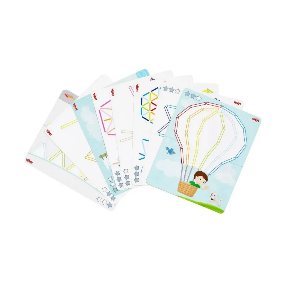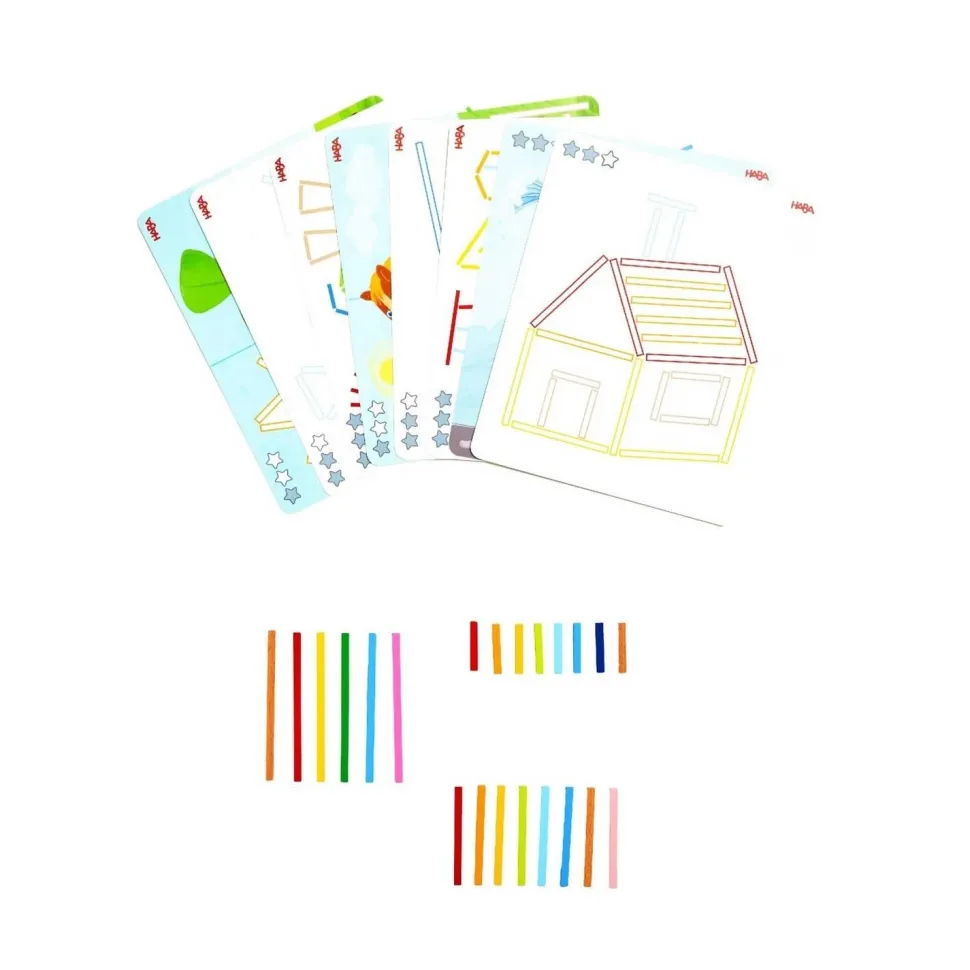 Contenu : 150 bâtonnets en bois, 8 cartes modèles imprimées des deux côtés.