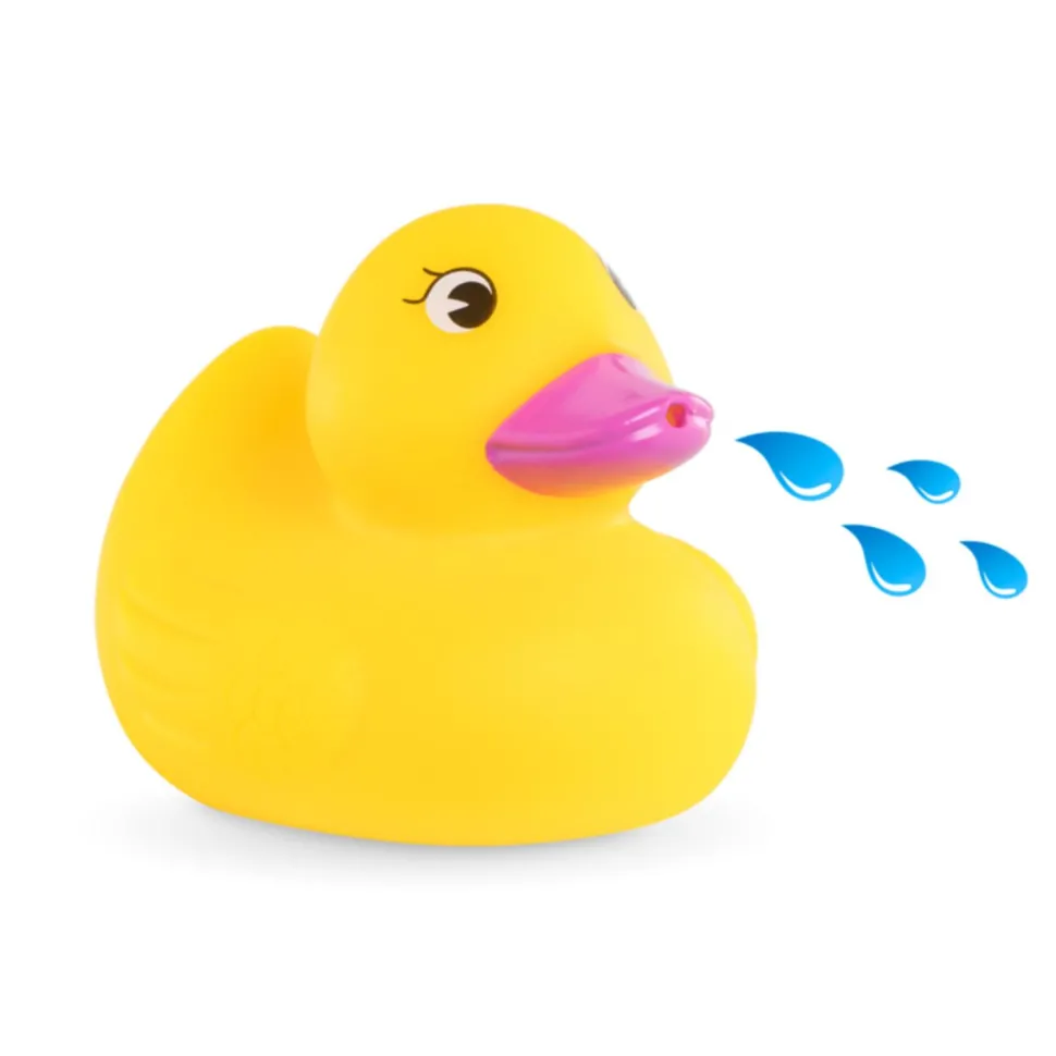 La baignoire fonctionne sans piles. Un jouet de bain aspergeur est inclus, il s’agit un joli petit canard jaune. Lorsqu’il est imergé puis que l’on appuie dessus; il crache de l’eau !
