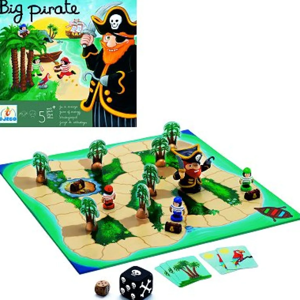 Découvrez ce jeu de société de la marque Djeco, adapté pour les plus petits à partir de 4 ans. Nombre de joueurs : de 2 à 4 joueurs. Durée d’une partie : environ 20 minutes.Contenu :. 1 plateau de jeu avec les éléments décoratifs. 2 dés. Cartes palmiers et perroquets. 3 moussaillons. 1 pirate. 3 coffres fortsDans un décor d’île paradisiaque avec cocotiers, sable blanc et perroquet, votre petite fille ou votre petit garçon appréciera ce jeu de stratégie. Comme tous les autres jouets de la gamme Djeco, les couleurs sont vives et les illustrations sont très bien réalisées. La force de ce jeu réside dans le fait que les petits joueurs s’unissent et montent une stratégie afin de récupérer le trésor sans se faire prendre. Les enfants doivent faire preuve d’imagination et de logique pour vaincre Big Pirate. Ce jeu de société peut aussi se révéler très utile dans l’apprentissage des chiffres par les enfants. Les éléments en 3D comme le coffre, les moussaillons et le pirate donnent plus de réalisme à ce jeu de société. Votre enfant sera enchanté de ce beau cadeau. Il pourra s’amuser avec vous ou avec ses camarades et passer de très bons moments.