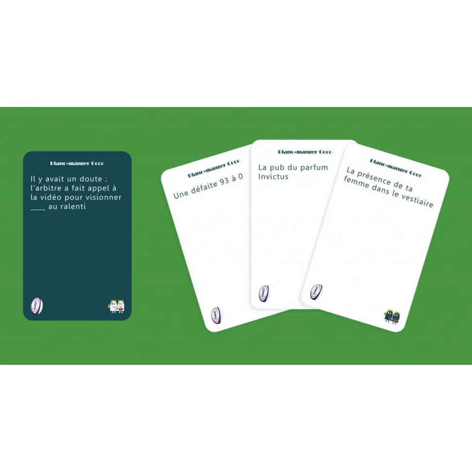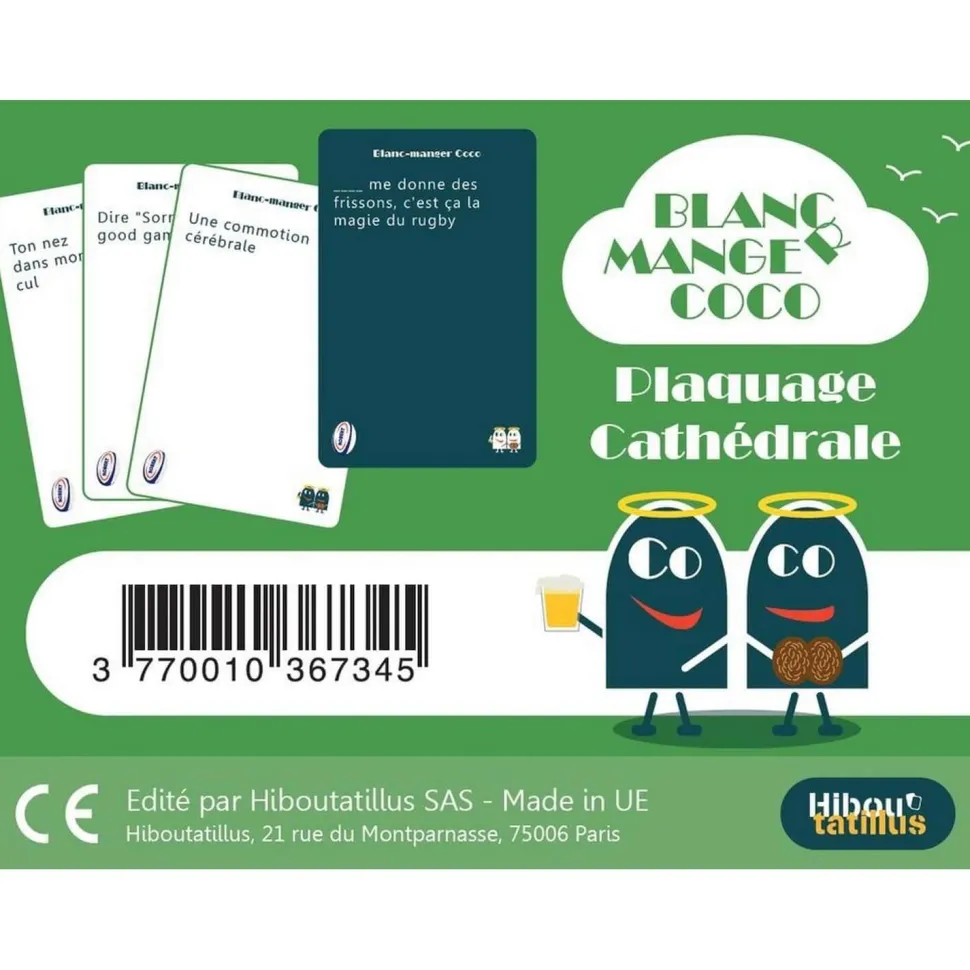 Plaquage Cathédrale est une extension du jeu Blanc Manger Coco portant sur la thématique du Rugby. Comme le jeu de base votre but est de compléter les phrases à trou avec vos cartes, la combinaison la plus drôle remporte le point.