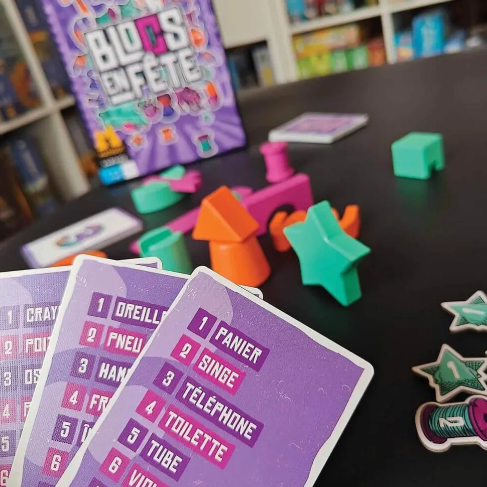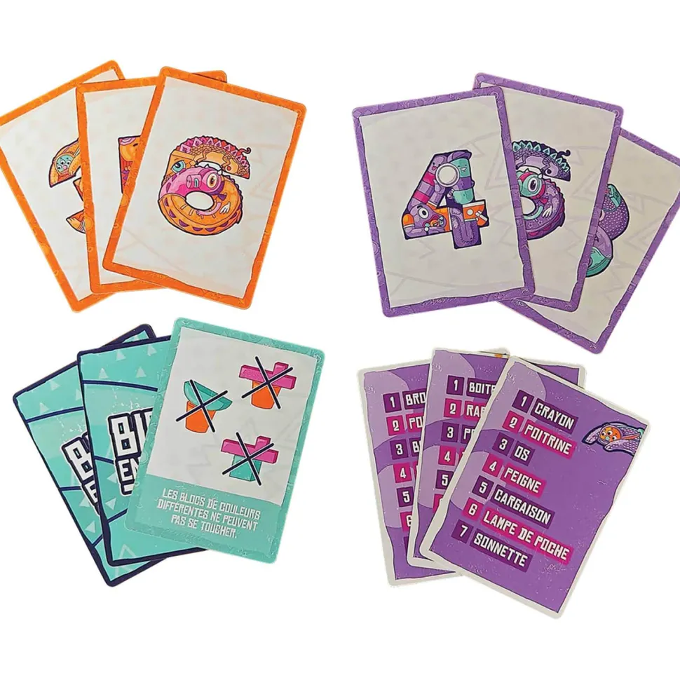 Contenu : 14 Cartes Chiffre; 36 Cartes Indices; 11 Cartes Construction; 15 Blocs en bois de formes et de couleurs variées; 46 Jetons Score; 1 Jeton premier joueur.