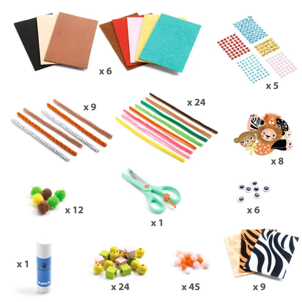 Contenu : 10 cartes prédécoupées et illustrées, 18 feuilles en feutrine, 6 feuilles en mousse, 24 perles en bois, 45 pompons, 33 fils chenilles, des bijoux autocollants, des yeux mobiles autocollants, 1 paire de ciseaux, 1 tube de colle + 10 fiches d’idées.