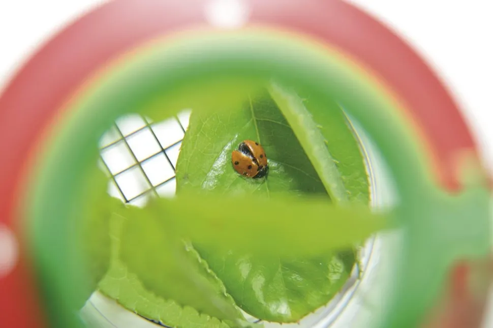 De petits coléoptères qui grandissent vraiment… Sur le couvercle avec loupe intégrée se trouve une deuxième loupe grossissante à replier sur la précédente. Grâce au motif à carreaux au fond de la boîte, quadrillé tous les 5 mm, il est possible de mesurer la taille de n’importe quel petit animal. Livré avec une araignée en plastique.