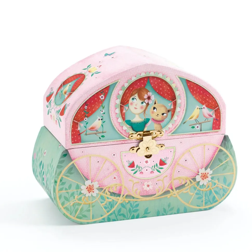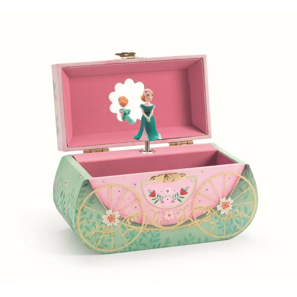 Balade en carrosse est une boîte à musique en forme de carrosse joliment illustrée pour ranger ses bijoux et secrets. Tournez la manivelle, ouvrez la boîte et surprise : une princesse finement sculptée tourne et se reflète sur un miroir silhouetté au son de la musique « Let Me Call You » de Leo Friedman. Intérieur tapissé d’un velours très doux. Un miroir silhouetté en forme de fleur. La mélodie dure approximativement 2 minutes 30.