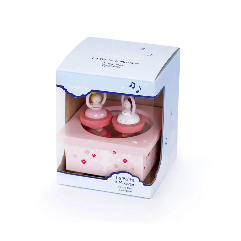 Les petites danseuses adoreront cette superbe boîte à musique rose en bois !Cette boîte à musique en bois est composée de plusieurs parties : un socle posé sur quatre pieds, une manivelle située sous le socle, une « piste de danse » aimantée et deux figurines.Les deux figurines représentent deux petites danseuses, les cheveux attachés en chignon, leur robe rose et blanche. Elles sont très rigolotes, de forme ronde et exécutent une figure. Placez-les sur la « piste de danse », tournez la manivelle et regardez les danseuses tourner sur elles-mêmes tout en écoutant la musique douce.Le socle est rose pale et sur le côté, vous découvrirez un dessin de danseuse exécutant une figure et des petites fleurs.Hauteur d’une figurine : 5.5 cm.Dimensions de la boîte à musique (hors figurines) : 11.5 x 6.5 x 11.5 cm.