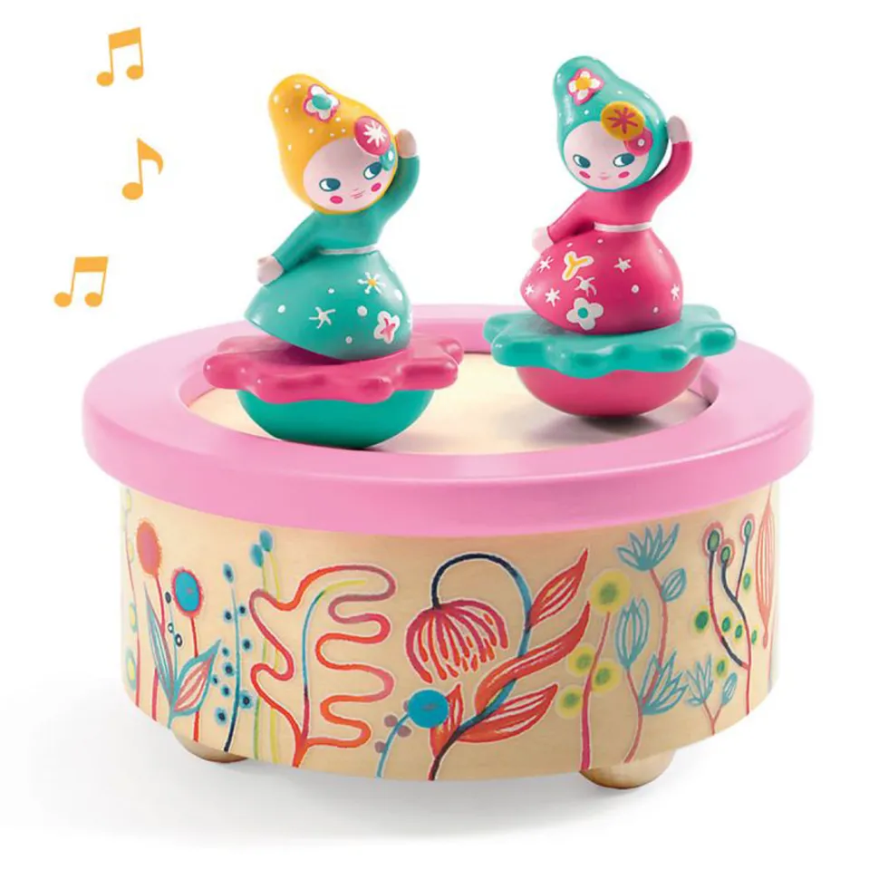 Une boîte à musique avec une douce mélodie, tellement jolie pour décorer la chambre.Cette boite à musique ronde est réalisée en bois avec deux petites figurines de valseuses en bois aimantées sur le dessus. Pour lancer la mélodie, il suffit de remonter le mécanisme. C’est alors que la musique La valse des fleurs, de Piotr Ilitch Tchaikovsky, retentit et que les deux valseuses se mettent à danser et tournoyer comme sur une piste, devant les yeux émerveillés de votre enfant. Idéale pour apaiser bébé et l’aider à s’endormir, cette boîte à musique fera un superbe cadeau de naissance.Dimensions de la boîte à musique : 12,2 x 11 x 12.2 cm.