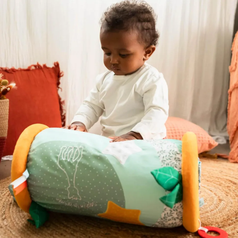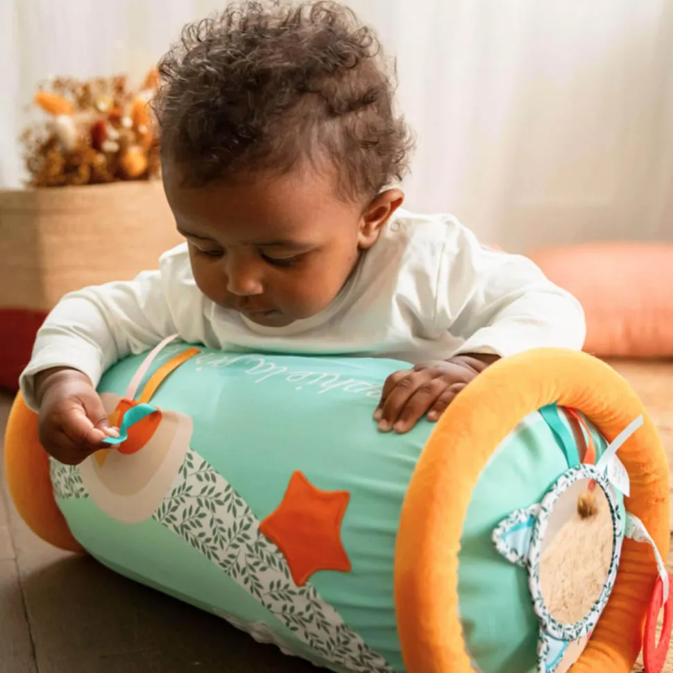 Ce rollin’ en tissu imprimé avec des illustrations de Sophie la girafe et de ses amis est conçu comme un cylindre sur lequel bébé pourra s’allonger, s’asseoir et chevaucher en toute sécurité grâce à ses rebords molletonnés.