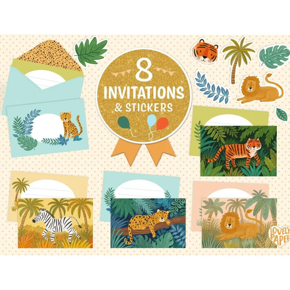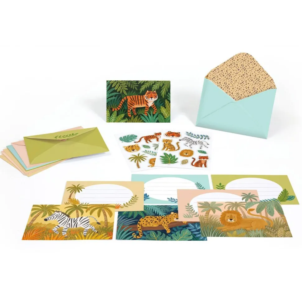 Un coffret d’invitations colorées sur le thème de la jungle, idéal pour organiser un anniversaire ou envoyer un petit mot amusant. Il contient huit cartes illustrées, huit enveloppes assorties et deux planches de stickers pour personnaliser chaque message. Un ensemble raffiné et ludique, parfait dès 6 ans pour initier les enfants à la correspondance avec style.