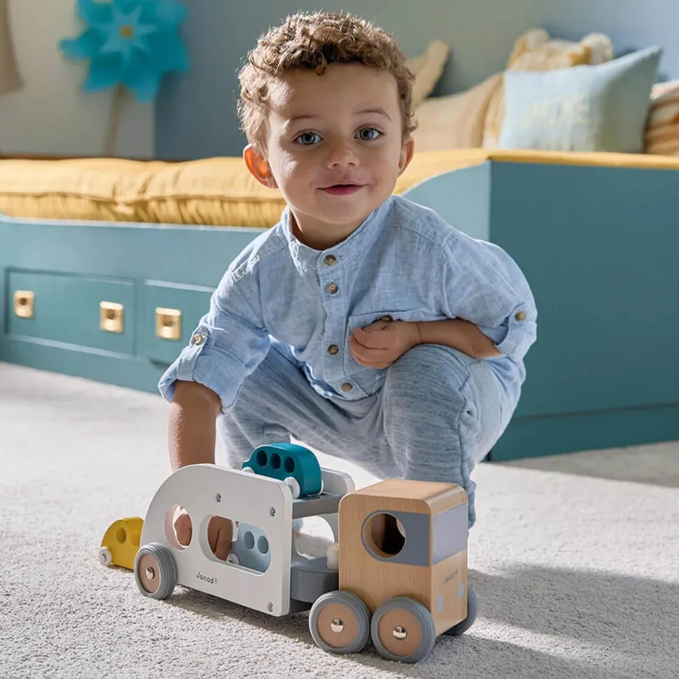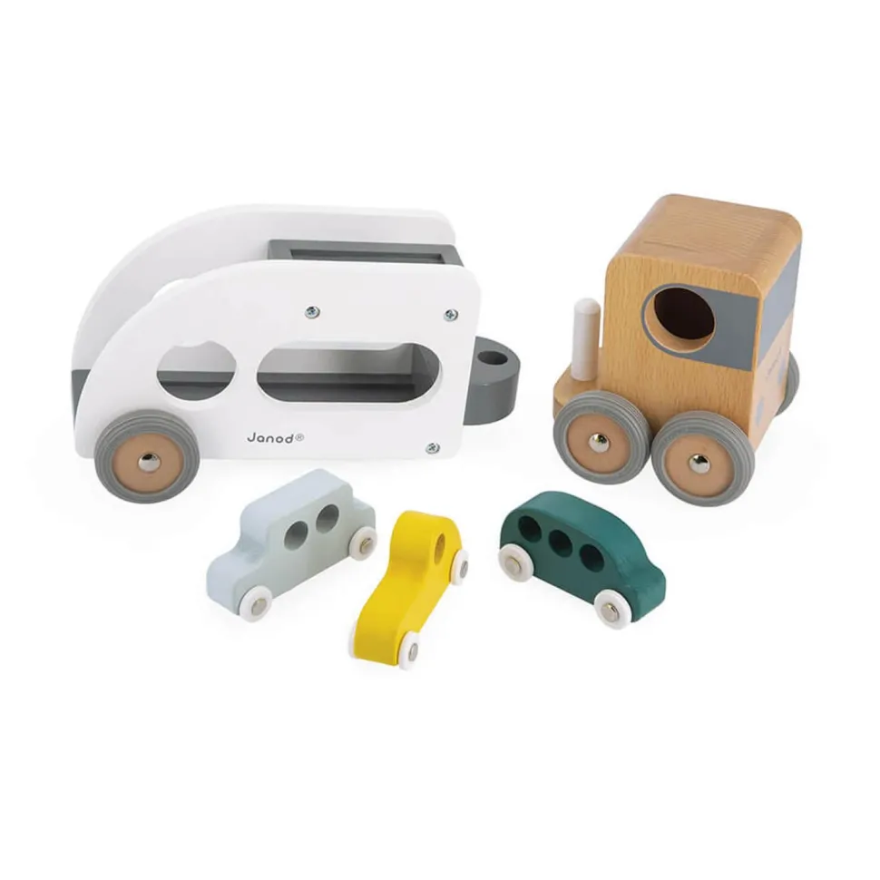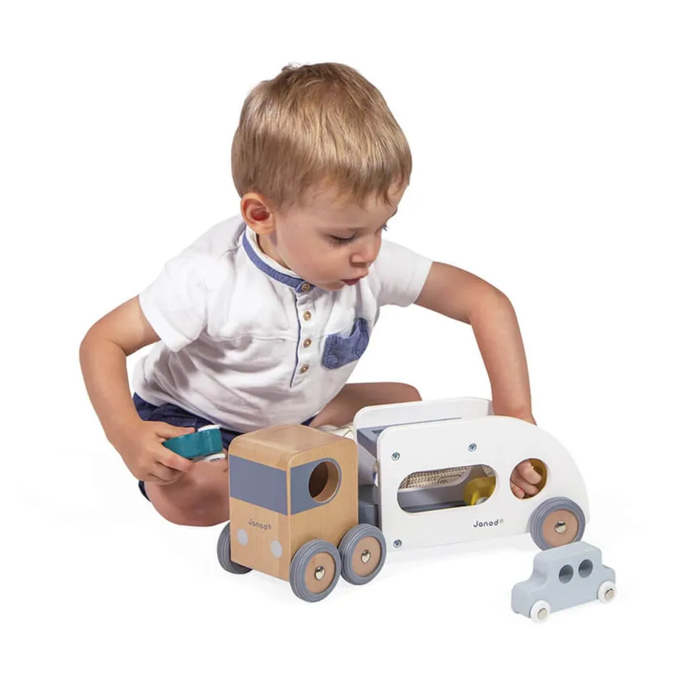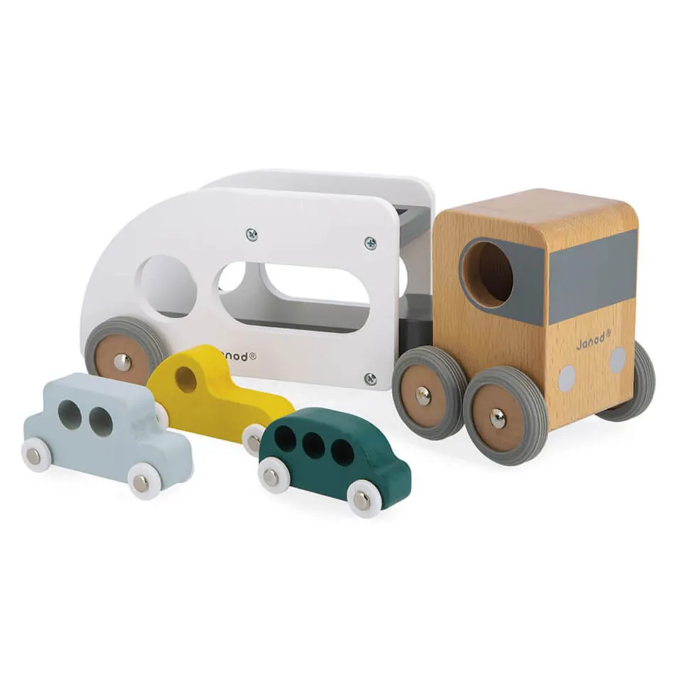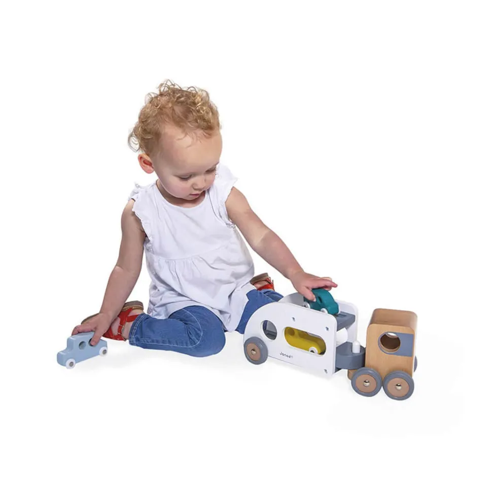 Magnifique camion en bois avec 3 véhicules inclus, de la marque Janod avec sa remorque amovible pour enrichir les histoires !