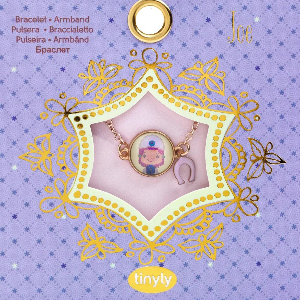 Découvrez la collection Joe avec le bracelet Tutti de la marque Djeco. Un bracelet délicatement conçu, composé d’un médaillon représentant la cavalière Tinyly « Joe », suspendu à une élégante chaîne en métal doré, et agrémenté d’un charms coloré en forme de fer à cheval, symbole de chance et d’aventure. Présenté dans une jolie pochette imprimée, ce bracelet allie finesse et imaginaire équestre. Grâce à son fermoir pratique, il s’ajuste facilement au poignet des enfants, pour un bijou aussi confortable qu’enchanteur à porter au quotidien.