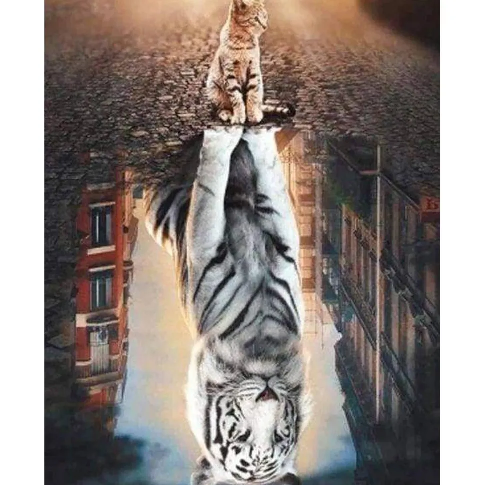 Description du produit : Broderie diamant : Chat Reflet dans la Ville – sans chassis en bois