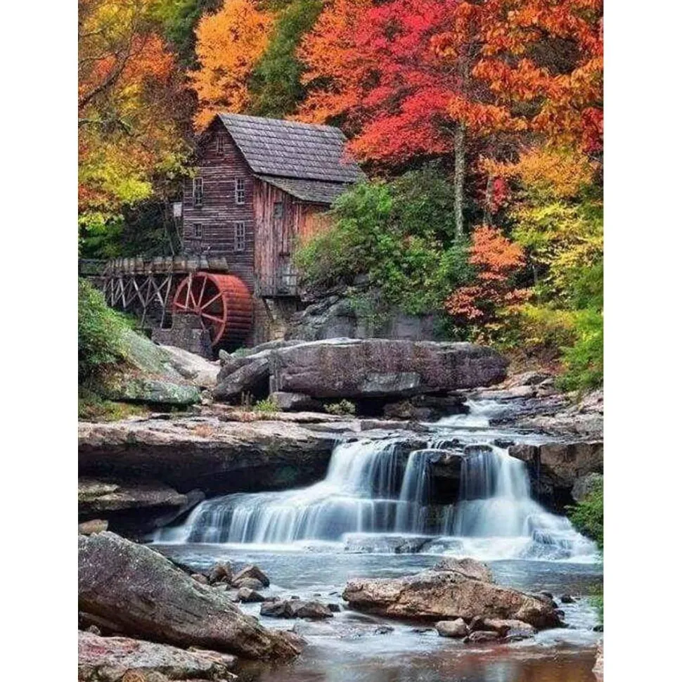 Caractéristiques détaillées : Broderie diamant : Relais de Montagne et Cascade – sans chassis en bois