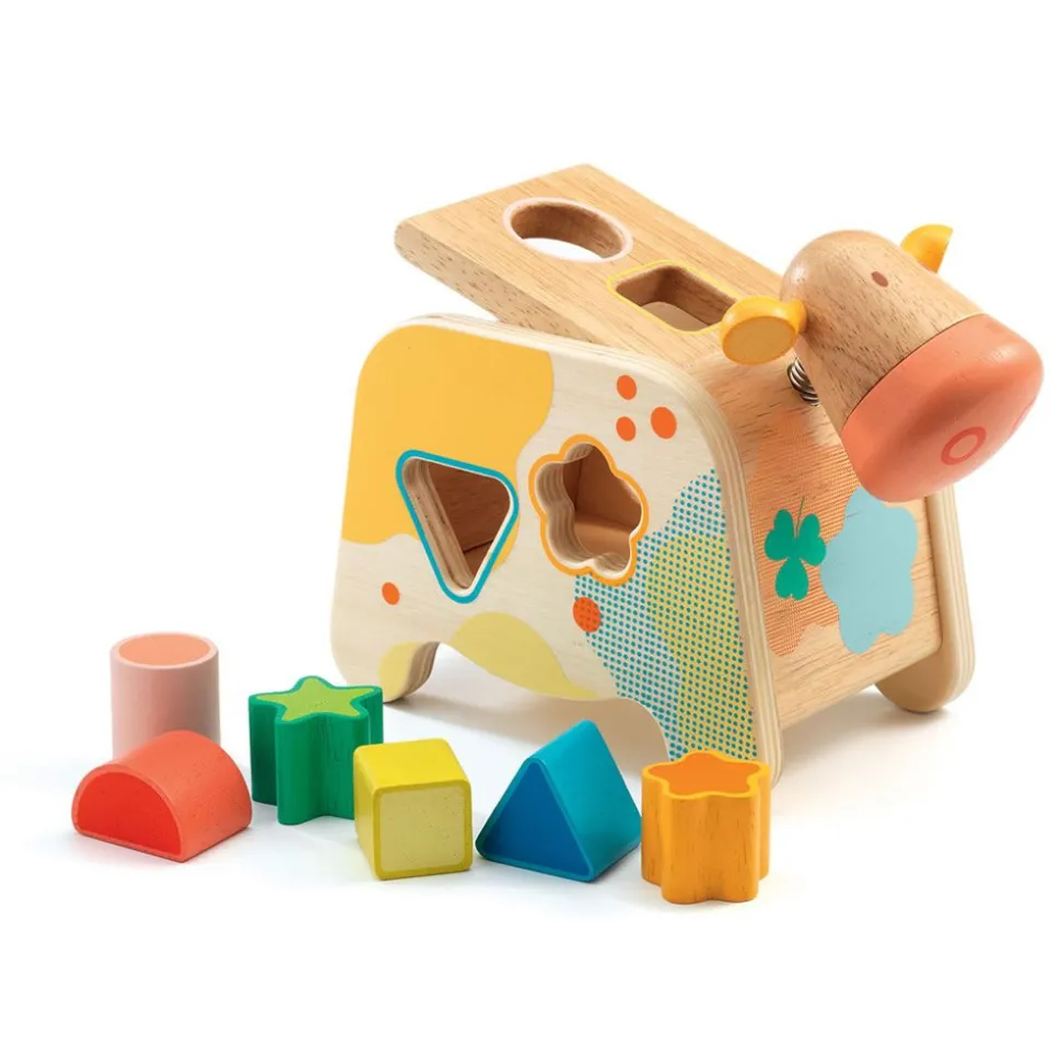 Maggy est une jolie vache colorée en bois où l’enfant doit y glisser les éléments aux formes géométriques. 6 éléments.Dimensions : 17 x 21 x 10.5 cm.