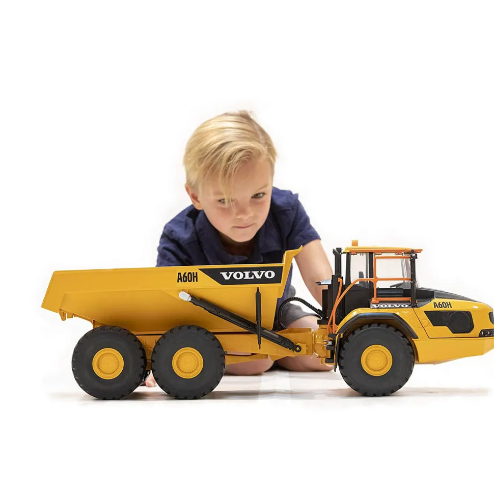 Les chantiers c’est votre affaire et les gros engins cela ne vous fait pas peur. Avec ce camion benne très réaliste, apprenez à jouer les conducteurs de travaux !Ce camion benne jaune de marque Bruder est un modèle réduit en plastique de camion à l’échelle 1/16. Il s’agit d’un véhicule modèle A60H Volvo, le même type de camion que l’on retrouve pour les travaux publics. Imaginez toutes sortes de chantier avec ce véhicule : Remplir la benne de sable ou de petits cailloux dans le jardin, rouler sur toutes sortes de terrains grâce aux grosses roues et vider la benne basculante.Le toit de la cabine est ouvrant afin d’y placer une figurine.Dimensions du camion (environ): 68 x 22.5 x 26,5 cm.Note : Figurines non incluses.