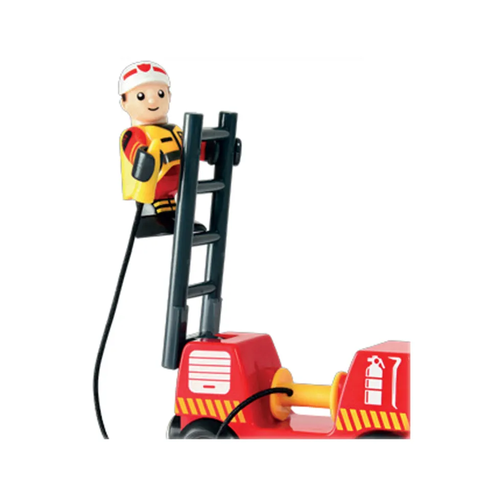 La sirène de la caserne des pompiers a retentit. Tous les pompiers ont pris leurs postes. Le camion est prêt pour intervenir au plus vite ! Contenu du coffret : – 1 camion de pompiers. – 1 remorque avec lance à incendie. – 1 pompier. Les pompiers ont activé la sirène du camion et leur gyrophare pour que les utilisateurs de la route dégagent la voie. Ils sont arrivés sur place et ont placé le panneau de signalisation pour que l’accident soit balisé. Attention, un début d’incendie se déclare… Heureusement le camion a une remorque équipée de la lance à incendie, il suffit de la dérouler et d’aller éteindre le feu naissant ! Le camion fonctionne avec 2 piles LR44.Dimensions de la boîte : 25.5 x 9 x 4.5 cm.