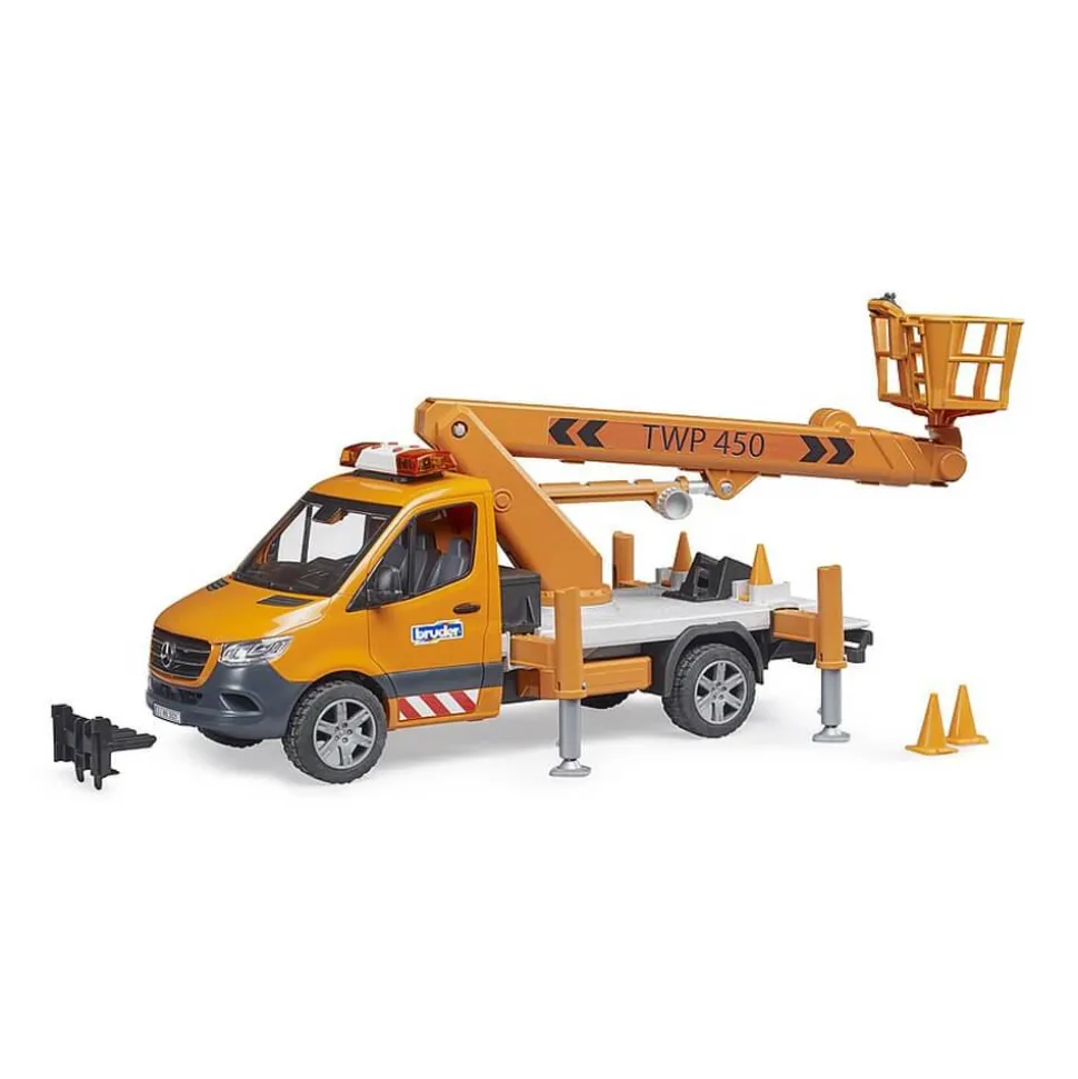 La toute dernière version de BRUDER est le MB Sprinter avec nacelle. Les plateformes de travail mobiles sont nécessaires pour effectuer des travaux en hauteur, par exemple sur des arbres, des éclairages de rue ou des panneaux de signalisation. La plateforme de travail BRUDER permet de placer en toute sécurité chaque figurine bworld jusqu’à une hauteur de 70 cm ! Grâce à une technique intégrée, la nacelle reste constamment en position horizontale lorsque le bras de grue est déployé. Le véhicule est également équipé de 4 appuis télescopiques et de 4 pylônes pour délimiter la zone de travail. Le module son et lumière est déjà installé sur les portes de la cabine du Sprinter, ce qui permet de l’ouvrir et de garantir la sécurité et une bonne visibilité du véhicule.