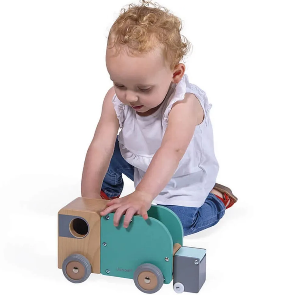 C’est le jour du ramassage des poubelles, avez-vous pensé à sortir la vôtre ? Ce beau camion poubelle en bois massif aidera à sensibiliser votre enfant à l’écologie et au recyclage. Pour plus de réalisme, ce camion vert, gris et en bois, est accompagné d’une poubelle aimantée qui bascule pour se vider à l’arrière du camion !