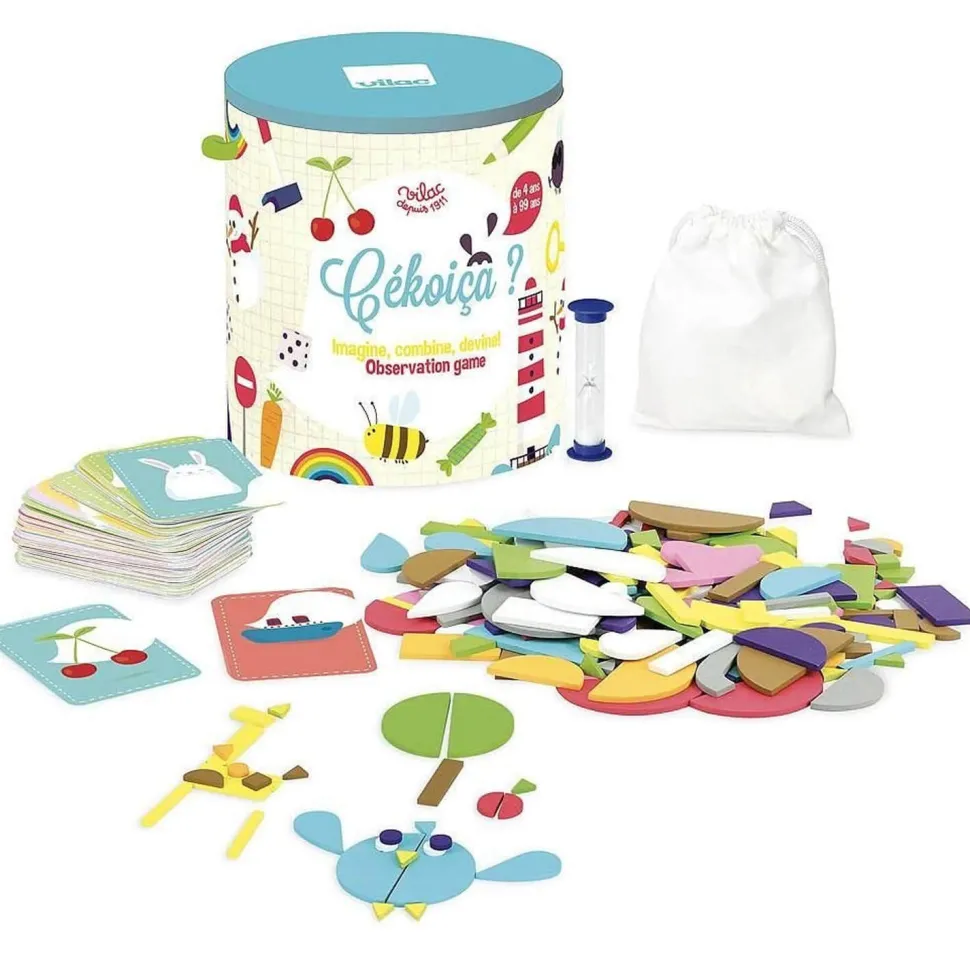 Cékoiça, un premier jeu de société avec des mots à faire deviner à partir de 4 ans !Le principe de ce jeu est simple en s’adressant aux plus jeunes : Assembler les formes géométriques à disposition pour faire découvrir des mots aux autres joueurs. Pour commencer, l’enfant, tire une carte et recompose une image, il n’a qu’une 1 minute pour faire deviner le mot !A vos marques ! Prêt ! Créer !Dimensions : 26.5 x 17 x 3.5 cm