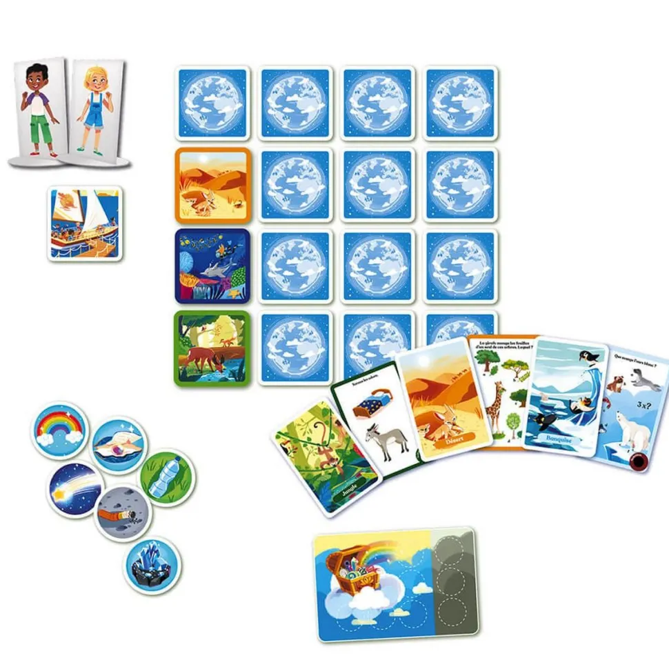 Ce jeu coopératif se compose de 120 cartes avec encre magique (on frotte son doigt pour faire apparaître la solution), d’un parcours de jeu composé de 19 cases, d’une carte trésor, de 20 jetons de trésors ou d’objets polluants et de 2 pions aventuriers.