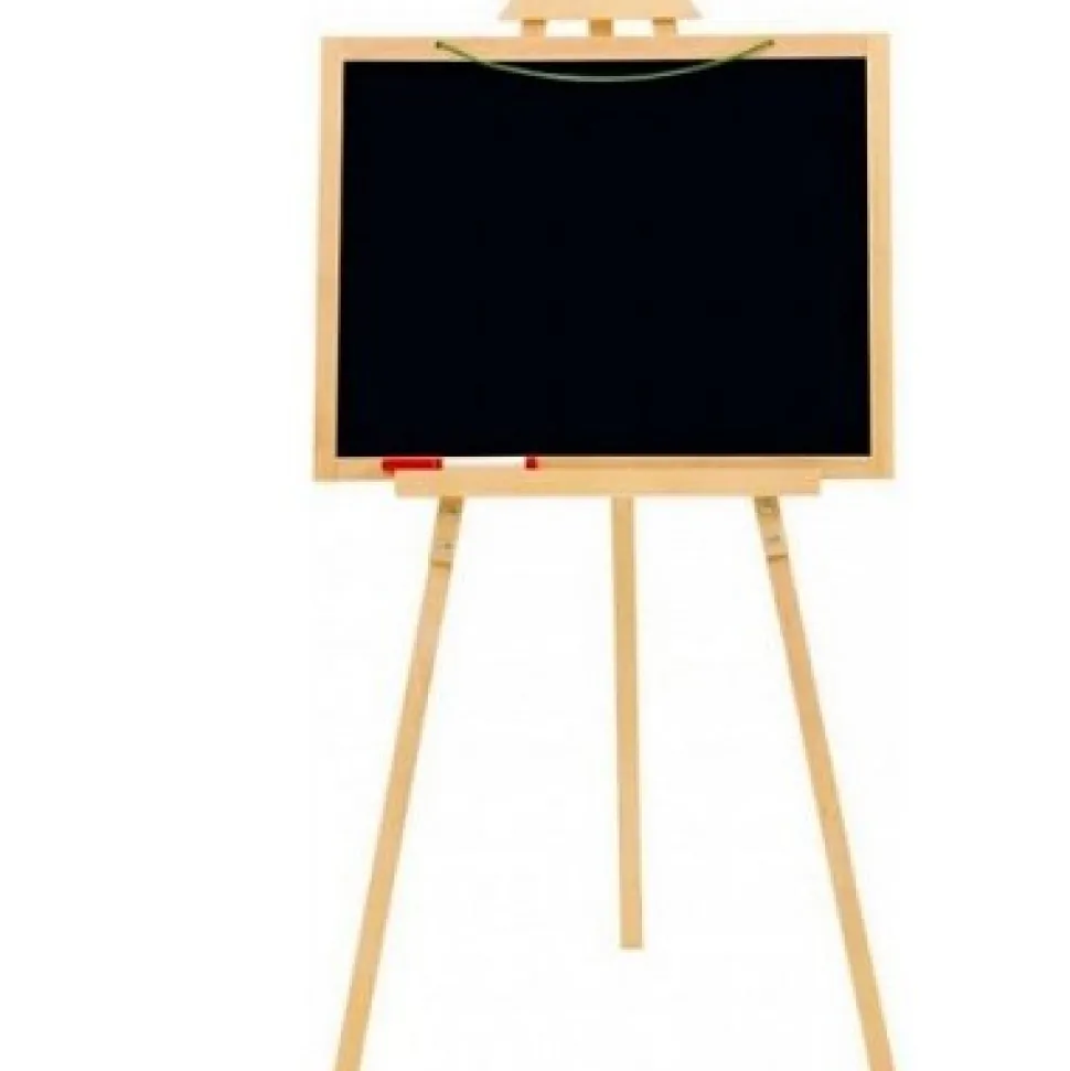 Ardoise réversible et à suspendre.Une face noire pour écrire a la craie; une face blanche magnétique pour feutre et lettres aimantées. Accessoires fournis : lettres aimantées, boîte à craie et feutre.Pieds démontables.Hauteur : 105 cm.Dimensions ardoises : 56 x 43 cm.Dimensions de la boîte : 58 x 57 x 5 cm.