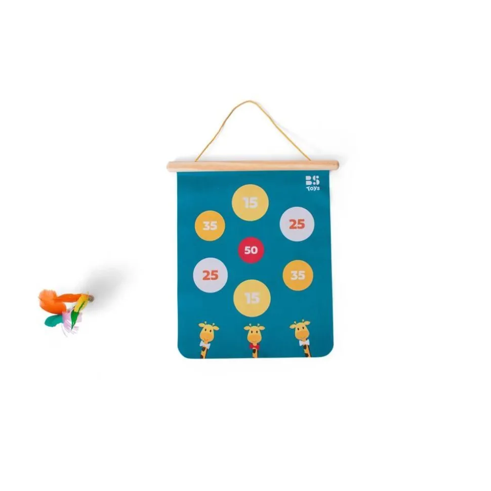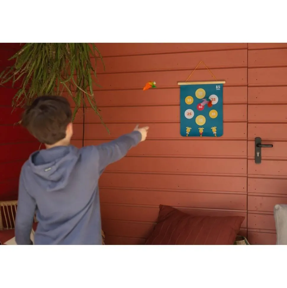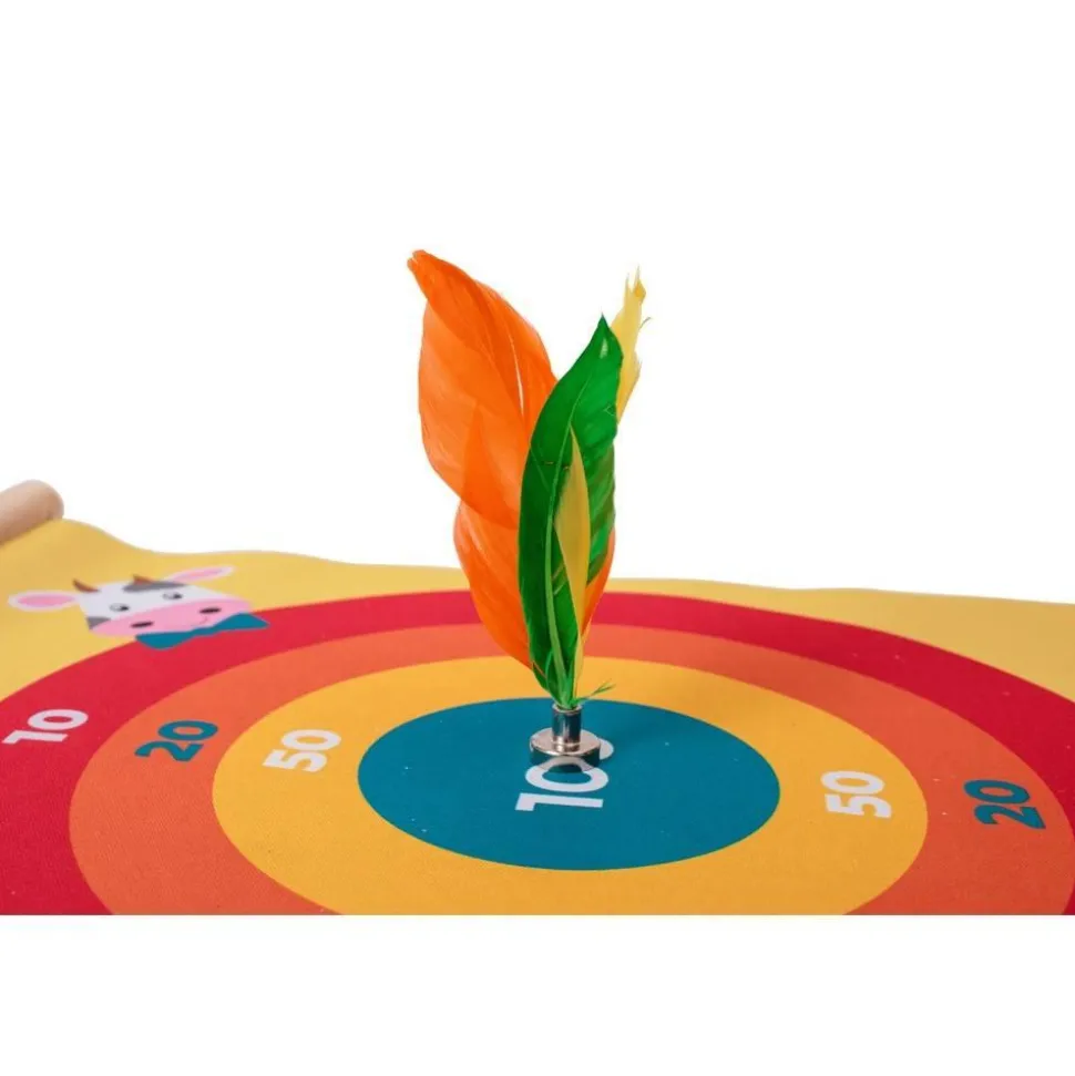 Contenu : Un tissu magnétique, bois, plumes et 1 cible suspendue, 40 x 31 cm x 4 fléchettes à plumes