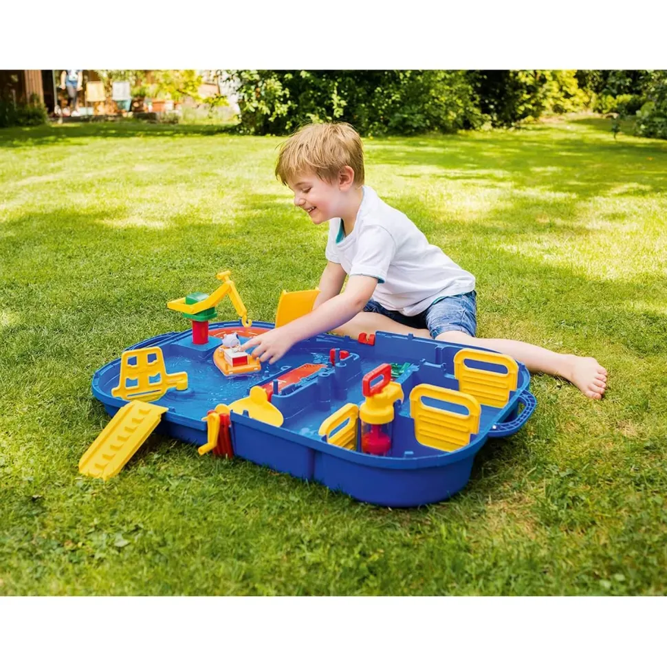 Le circuit d’eau portable LockBox d’Aquaplay est un best-seller. Il gardera vos enfants occupés pendant des heures et des heures. De nombreuses possibilités de jeu les attendent… Ils pourront laisser Wilma l’hippopotame naviguer avec le bateau à container à travers le circuit. Ils régleront selon leurs envies le niveau d’eau en utilisant la pompe et en ouvrant les barrières. C’est une manière créative de leur montrer comment l’eau se soulève et monte. Le camion amphibie ne pourra que leur plaire ! Il peut aller de la terre à l’eau, traverser les ponts et attendre que la grue le charge de containers au niveau du port. En tournant la roue à aube, l’eau se mettra en mouvement dans les canaux : une manière ludique de montrer à vos enfants comment l’eau se déplace !